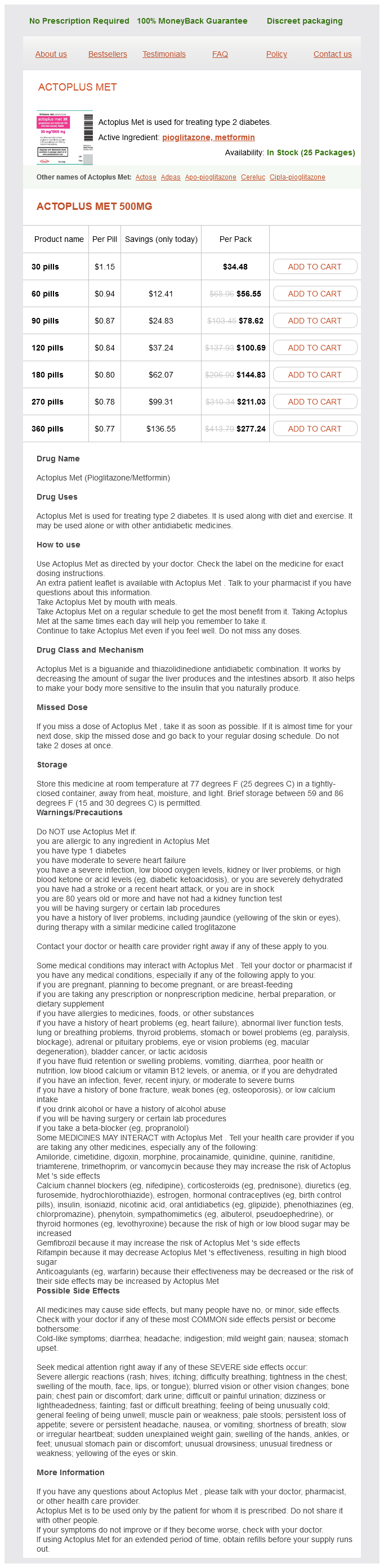 Actoplus Met packs: 30 pills, 60 pills, 90 pills, 120 pills, 180 pills, 270 pills, 360 pills