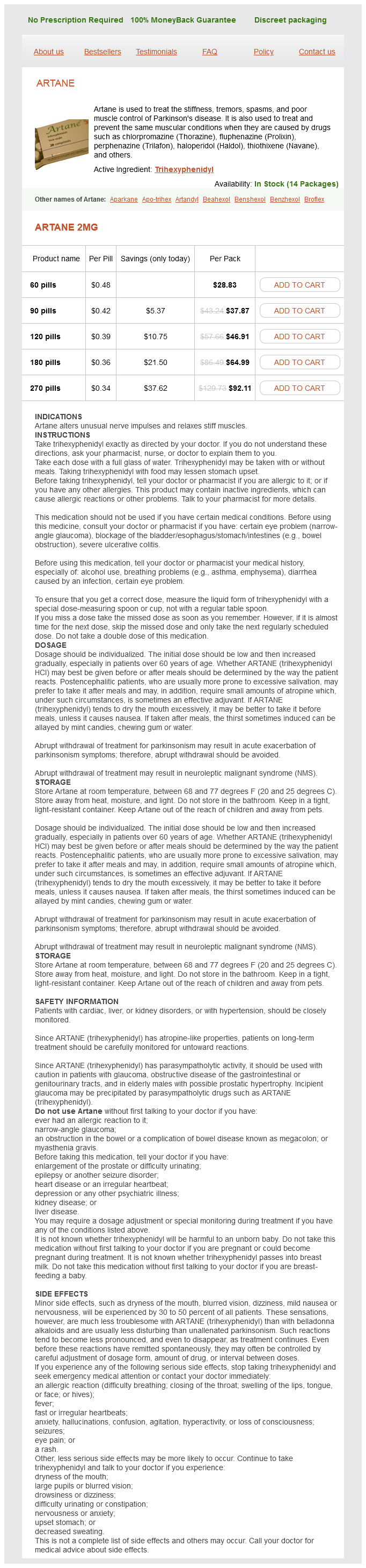 Artane packs: 60 pills, 90 pills, 120 pills, 180 pills, 270 pills