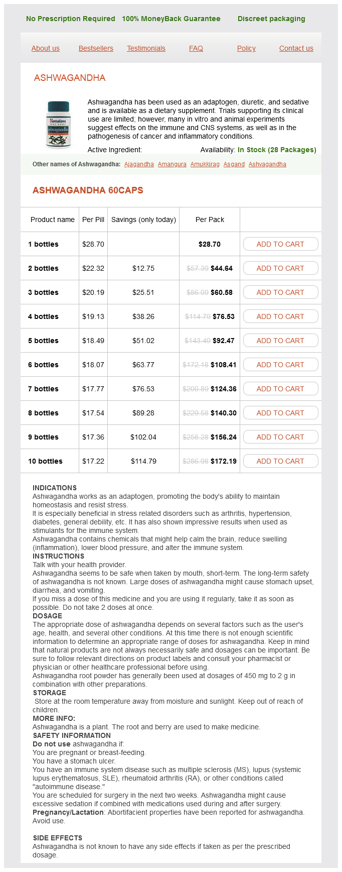 In terms of diet anxiety jokes discount ashwagandha 60 caps visa, a well-balanced meal should consist of a wide variety of ingredients and good proportions of carbohydrates, proteins, and fats. Scheduled emptying and deposition of suppositories will also lead to a regular frequency of evacuation. If these methods do not work, then medications are supplemented to the existing regimen. This includes macrogol, high doses of psyllium, prokinetics, digestive enzymes, and many other agents combined to provide a customized treatment for each individual. Randomized trials comparing this intervention to other traditional conservative bowel management programs showed transanal irrigation to be beneficial in reducing constipation, reducing fecal incontinence, and improving quality of life (Christensen et al. There have been many proposed mechanisms but no unified theory behind the formation of the initial cystic structure. The formation has largely been attributed to hematomyelia, inflammatory responses leading to edema in the cord, ischemia, or arachnoiditis. Correlations exist between the presence of uncorrected kyphosis and stenosis and severity of symptoms. Injury to the spinothalamic tracts leads to pain and a dull, aching, or burning sensation at or above the level of injury. There may also be a dissociated sensory loss (loss of pain and temperature sensation without loss of light touch or proprioception). Measures that increase intra-abdominal pressure such as sneezing, coughing, or straining can increase the pain. Since a syrinx is typically unilateral, asymmetrical dysreflexia and ascending weakness may appear. Hyperhidrosis, autonomic dysreflexia, Horner syndrome, dysphagia, cardiopulmonary dysfunction, and bulbar signs and symptoms can present. Although the condition is progressive in most patients, some may have stable or resolving symptoms and radiographic appearance of the syrinx. While this problem is easy to diagnose with modern imaging, it is difficult to treat. Currently, 80% of patients who undergo a form of surgical intervention to treat their syrinx will have persistent or deteriorating findings on follow-up imaging. Modern-day therapies focus on one of four surgical options: shunting procedures, lysis of adhesions, correction of deformity or decompression, and cord transection. Correction of deformity or decompression is usually the preferable option, with good results in reducing the size of the syrinx.