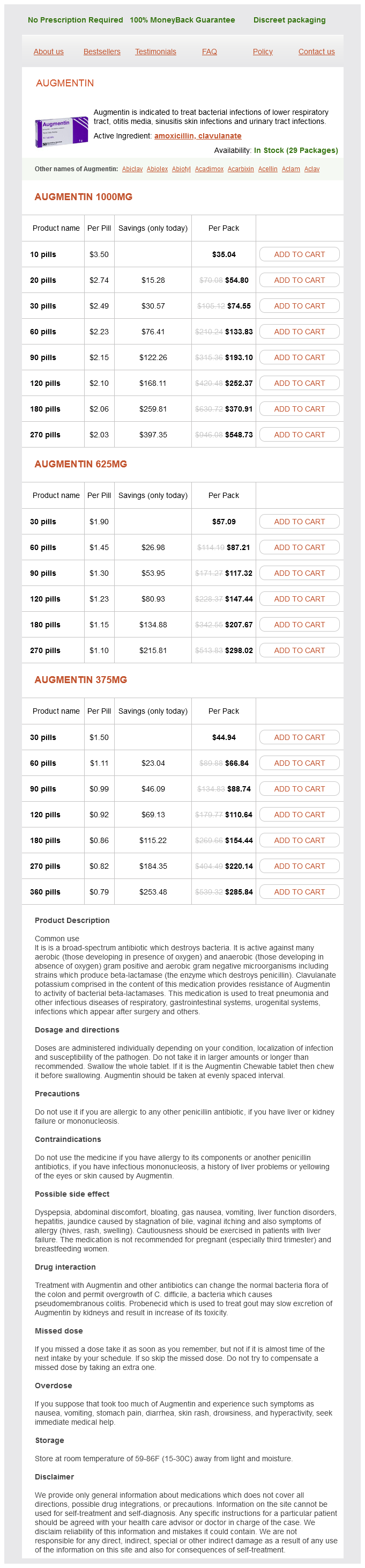 Augmentin packs: 10 pills, 20 pills, 30 pills, 60 pills, 90 pills, 120 pills, 180 pills, 270 pills, 360 pills