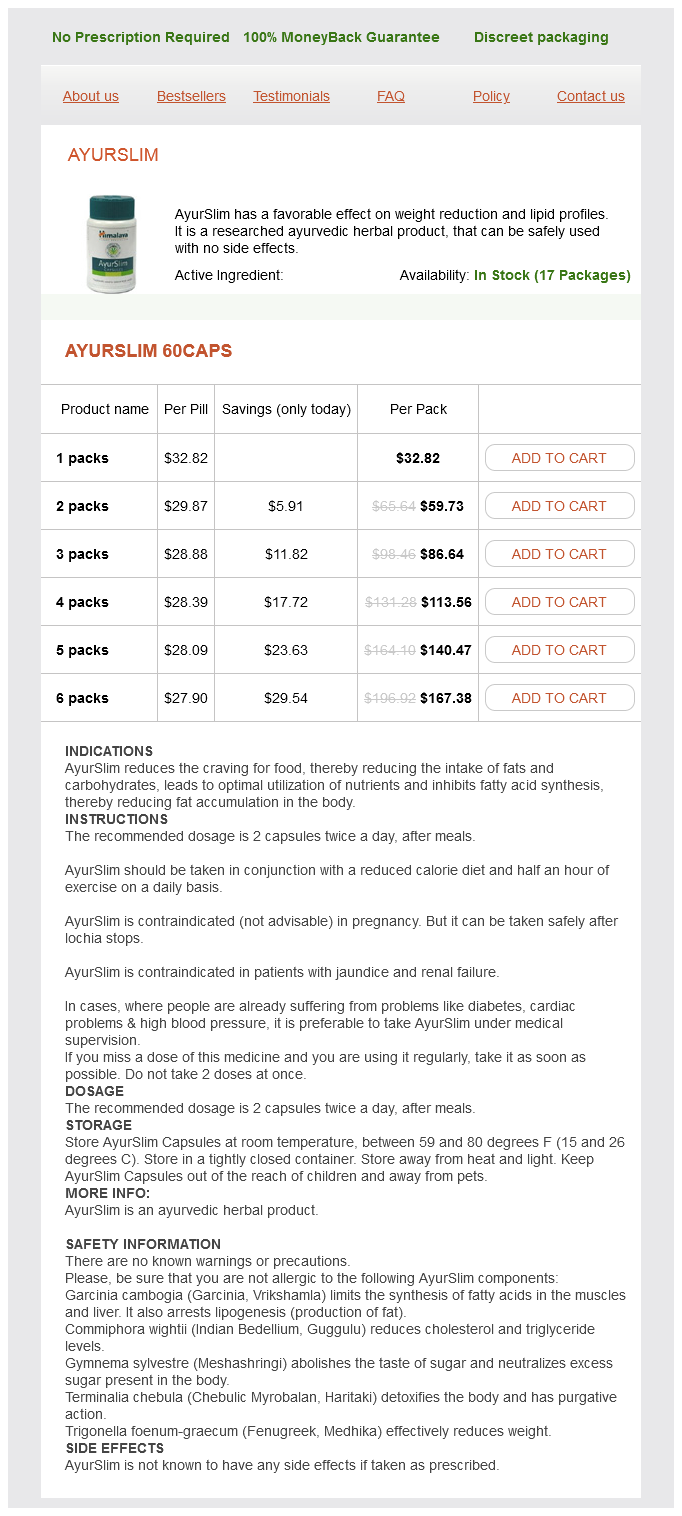 Ayurslim dosages: 60 caps