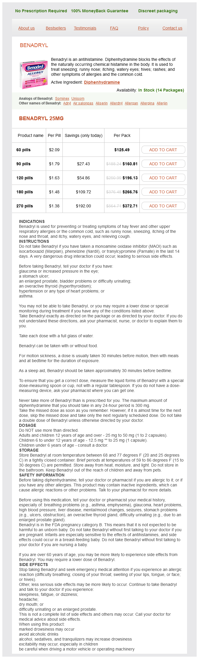 Benadryl packs: 60 pills, 90 pills, 120 pills, 180 pills, 270 pills