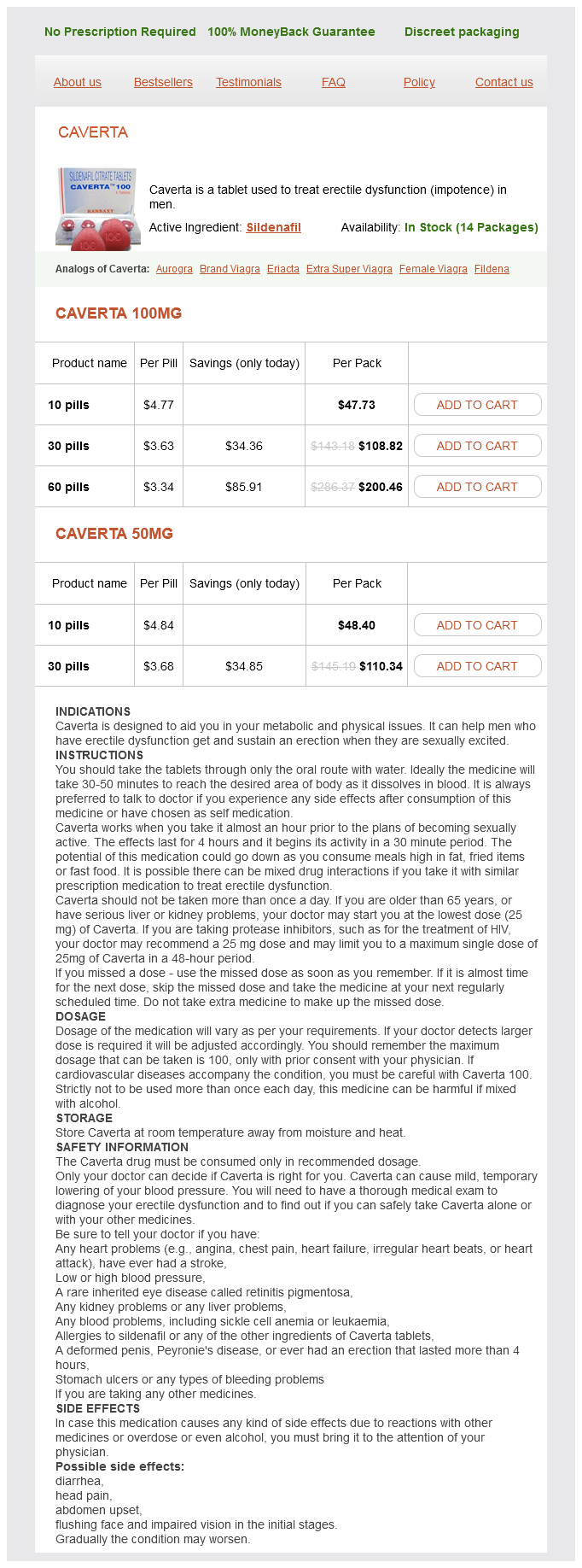 Seasonal peaks in the incidence of snakebite are associated with agricultural activities erectile dysfunction products discount caverta 100 mg with mastercard, such as ploughing before the annual rains in the West African sahel and the rice harvest in Southeast Asia, or to fluctuations in the activity or population of venomous snakes. Severe flooding, by concentrating human and snake populations in diminishing areas of dry land, has given rise to epidemics of snakebite, notably in Colombia, Pakistan, India, Bangladesh, Nepal, Burma, and Vietnam. Invasion of virgin jungle during construction of new highways and irrigation and hydroelectric schemes has led to an increased incidence of snakebite in Brazil and Sri Lanka. On rare occasions, snakebite or injection of snake venom has been used for recreational purposes, suicide, or homicide. In snake-infested areas, boots, socks, and long trousers should be worn for walks in undergrowth or deep sand, and a light and walking stick should always be carried at night. Collecting firewood; dislodging logs and boulders with bare hands; pushing sticks or fingers into burrows, holes, and crevices; climbing rocks and trees covered with dense foliage; and swimming in overgrown lakes and rivers are particularly hazardous activities. Sleeping on the ground carries a risk of nocturnal krait bites in South Asia and of spitting cobra bites in Africa, but well-tucked-in mosquito nets are protective. Attempting to *Scientific (Latin) names are important because they are used internationally to describe the range of specificity of antivenoms. Specific antivenoms are manufactured for the treatment of envenoming by all these species (see Table 137. Various substances toxic to snakes, such as insecticides and methylbromide, have been used to keep human dwellings free of these animals. Cardiovascular and Autopharmacologic Toxins Some venoms release vasodilating autacoids such as histamine and kinins. Sarafotoxins from the venom of the Israeli burrowing asp (Atractaspis engaddensis) are similar to physiologic endothelins. They are potent vasoconstrictors of the coronary arteries and delay atrioventricular conduction. The venom duct opens within a sheath at the base of the fang, and venom is conducted toward the tip in a partially or completely closed groove or fang canal. Venomous snakes can inject doses of venom lethal to their natural prey at each of 10 or more consecutive strikes. Whether the dose can be adjusted according to the size of the prey or the intention of the snake is controversial. The high proportion of bites without envenoming ("dry bites") reported for species such as Calloselasma rhodostoma (>50%) or Pseudonaja spp. There is no support for the popular belief that snakes are less dangerous after they have eaten. The snake uses only a small fraction of the content of its venom gland at each strike. Variation in Venom Composition Venom composition varies enormously from species to species but also within a single species throughout its geographic range, at different seasons of the year, and ontogenically as the snake matures. Pharmacology When snakes bite people, venom is inoculated subcutaneously or intramuscularly. Smaller Mw elapid neurotoxins are rapidly absorbed into the bloodstream, whereas larger Mw phospholipase A2 presynaptic toxins and viperid enzymes are taken up more slowly through the lymphatics, sometimes causing visible lymphangitis and enlarged, painful lymph nodes.