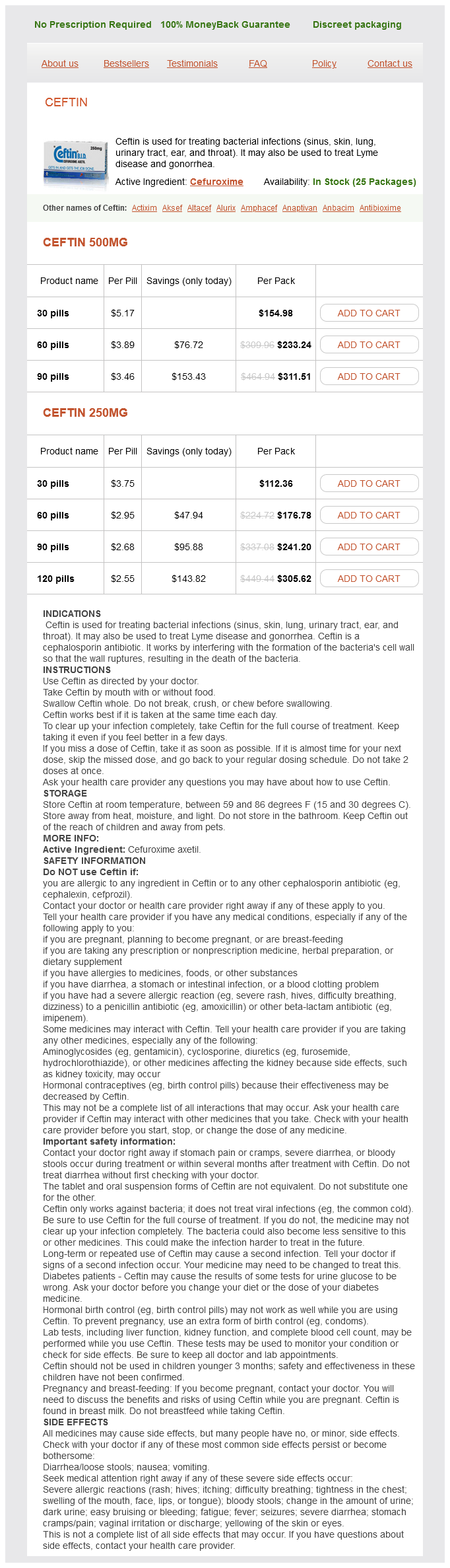 Ceftin packs: 30 pills, 60 pills, 90 pills, 120 pills