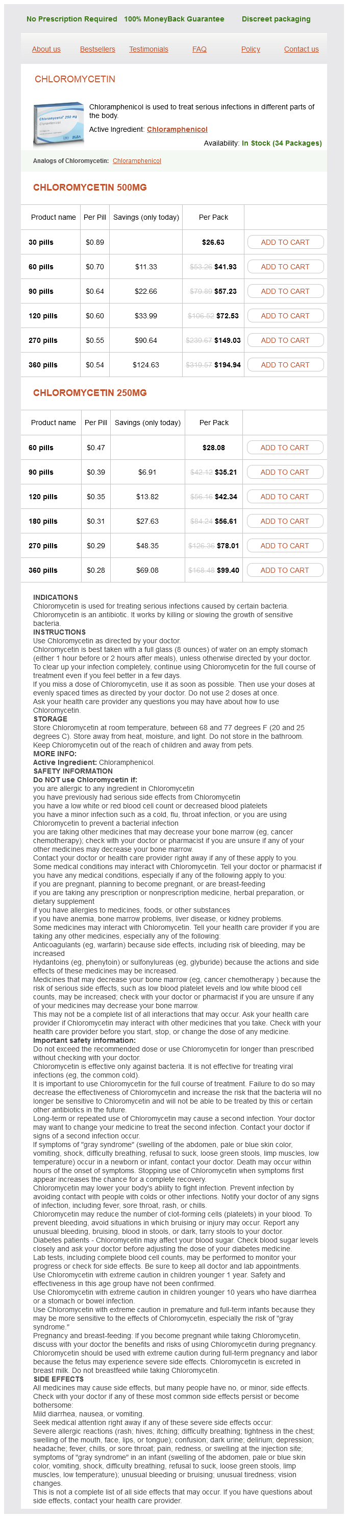 Chloromycetin packs: 30 pills, 60 pills, 90 pills, 120 pills, 270 pills, 360 pills, 180 pills