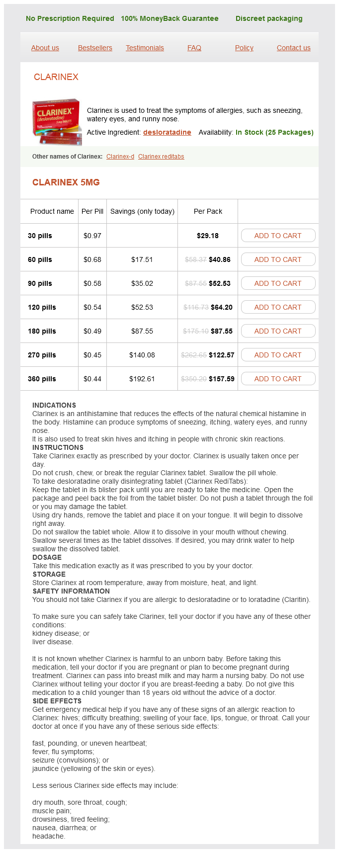 Clarinex packs: 30 pills, 60 pills, 90 pills, 120 pills, 180 pills, 270 pills, 360 pills