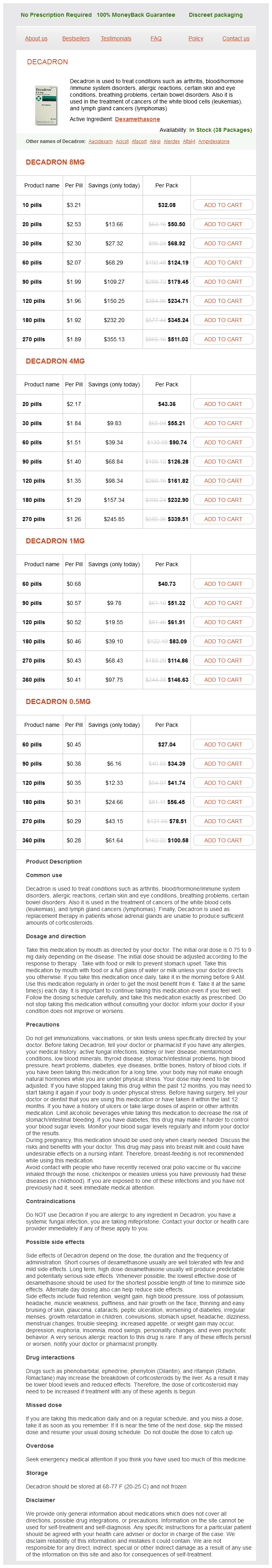 Decadron packs: 10 pills, 20 pills, 30 pills, 60 pills, 90 pills, 120 pills, 180 pills, 270 pills, 360 pills