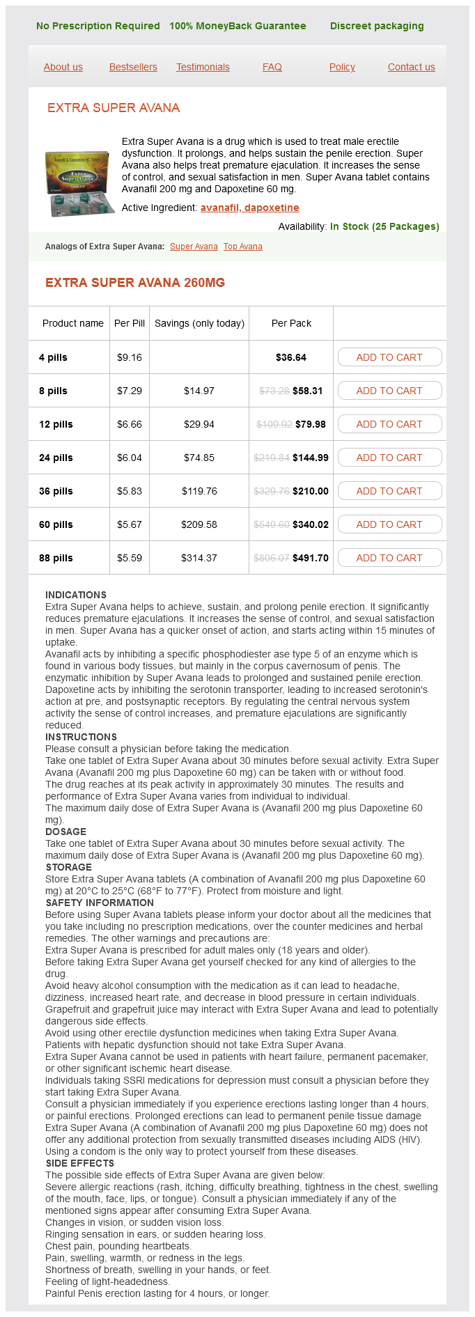 Extra Super Avana packs: 4 pills, 8 pills, 12 pills, 24 pills, 36 pills, 60 pills, 88 pills