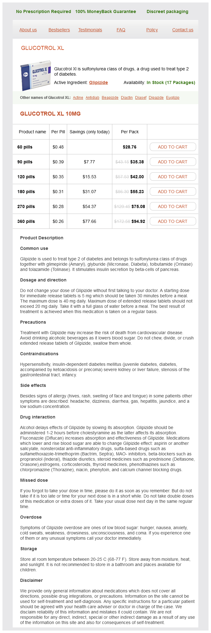 Glucotrol XL packs: 60 pills, 90 pills, 120 pills, 180 pills, 270 pills, 360 pills