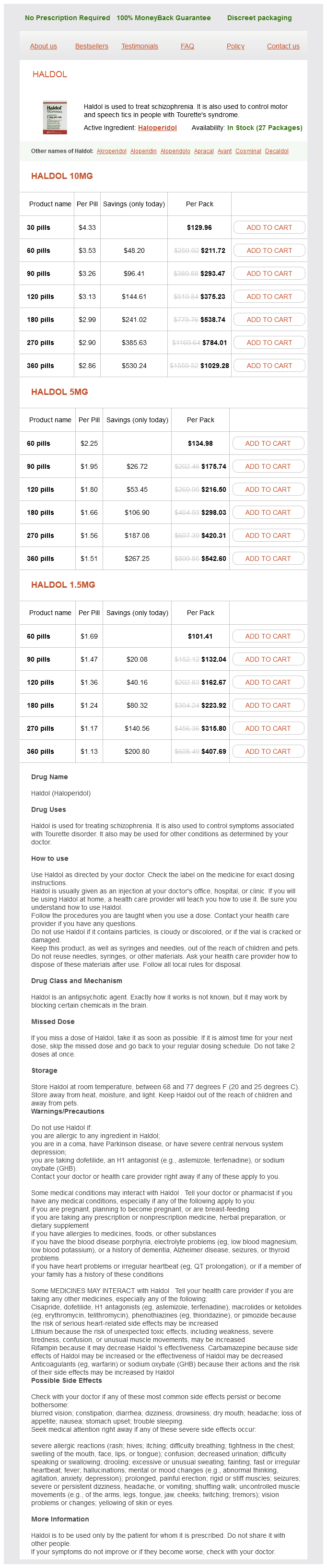 Haldol packs: 30 pills, 60 pills, 90 pills, 120 pills, 180 pills, 270 pills, 360 pills