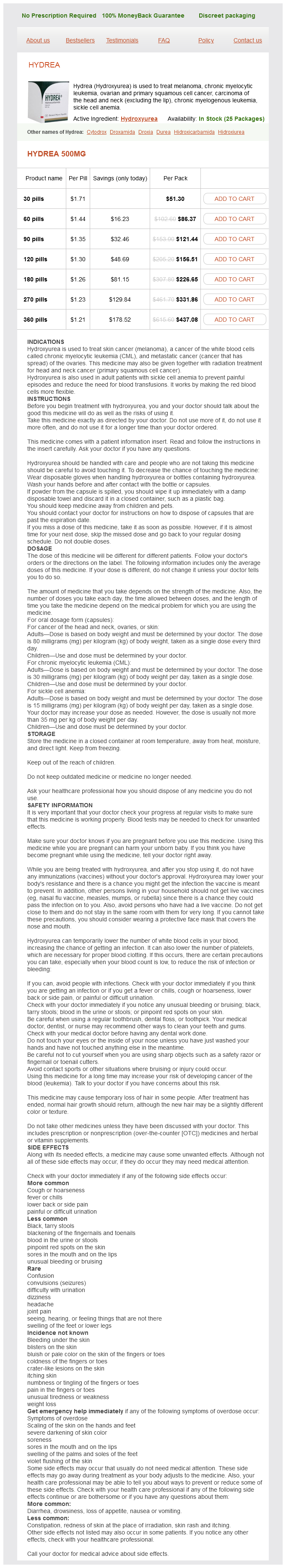 Hydrea packs: 30 pills, 60 pills, 90 pills, 120 pills, 180 pills, 270 pills, 360 pills