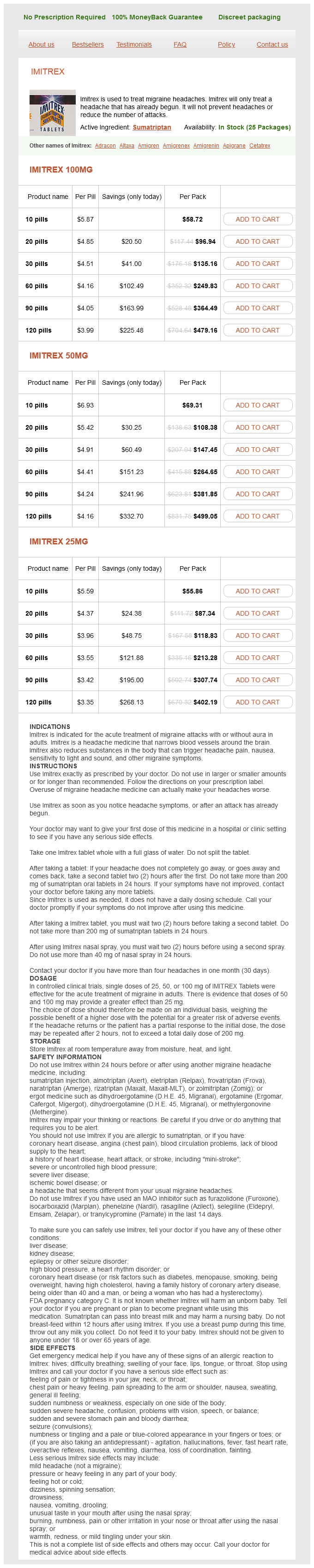 Imitrex packs: 10 pills, 20 pills, 30 pills, 60 pills, 90 pills, 120 pills