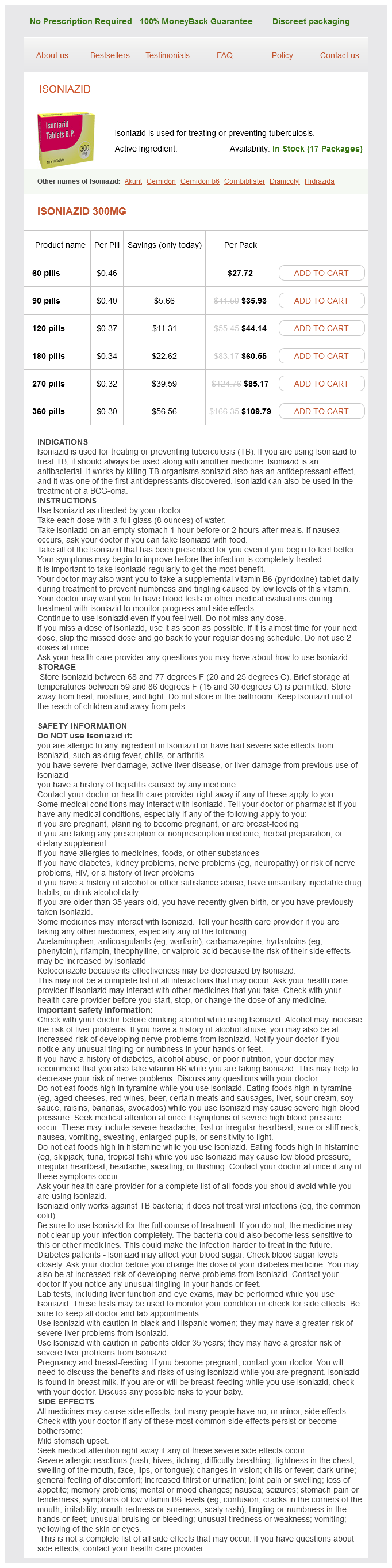 Isoniazid packs: 60 pills, 90 pills, 120 pills, 180 pills, 270 pills, 360 pills