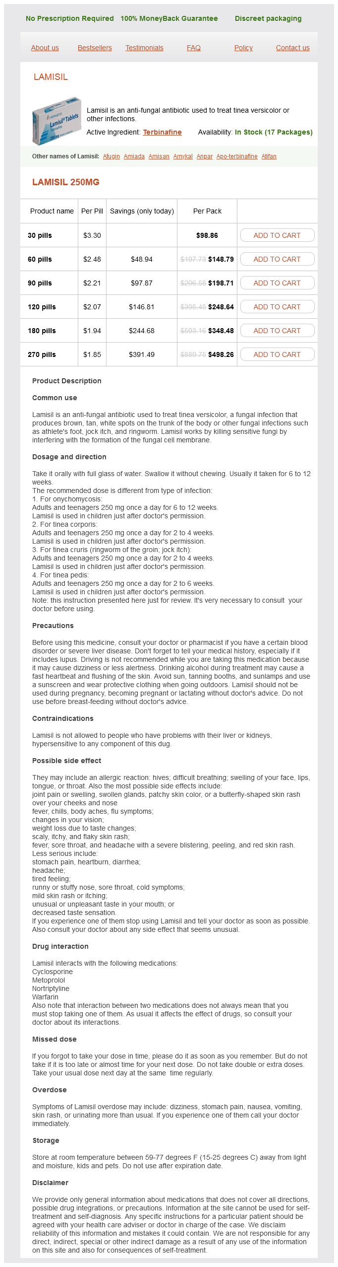 Lamisil packs: 30 pills, 60 pills, 90 pills, 120 pills, 180 pills, 270 pills