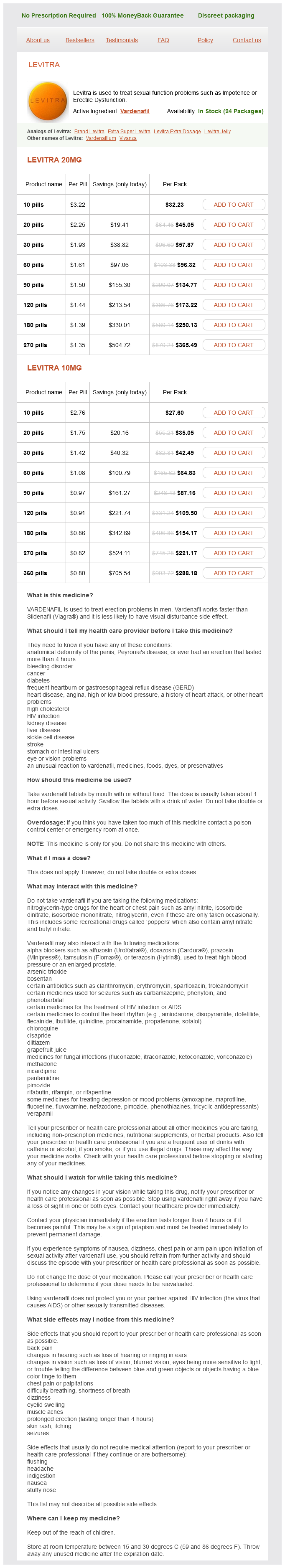 Levitra packs: 10 pills, 20 pills, 30 pills, 60 pills, 90 pills, 120 pills, 180 pills, 270 pills, 360 pills