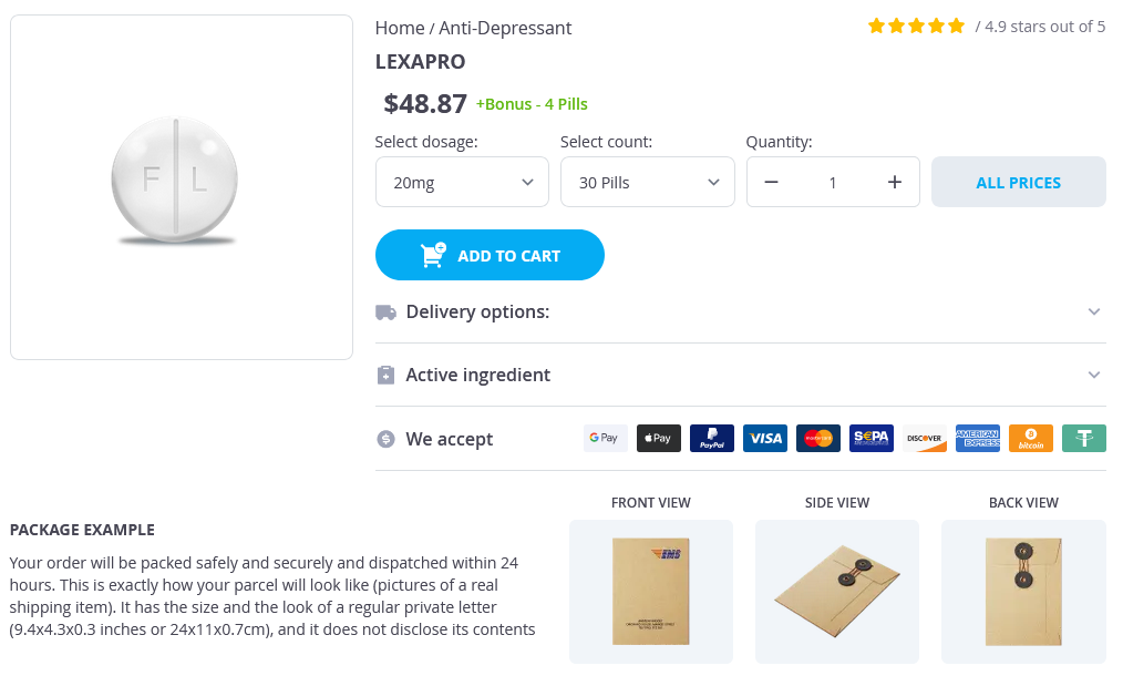 Lexapro packs: 30 pills, 60 pills, 90 pills, 120 pills, 180 pills, 270 pills, 360 pills