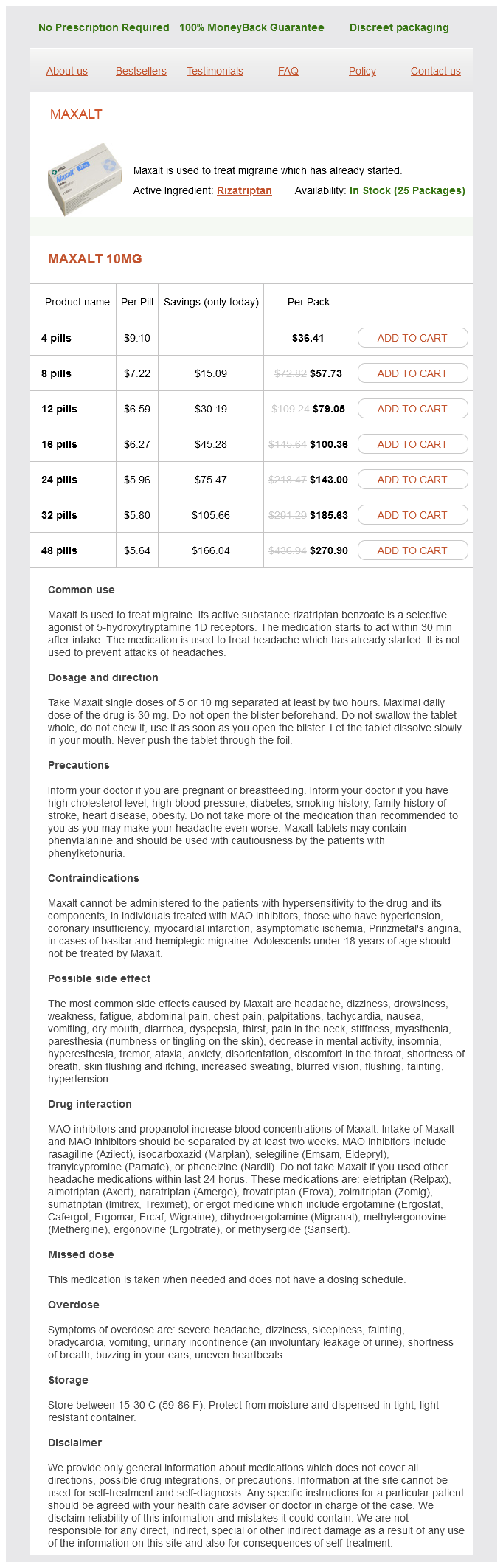 Maxalt packs: 4 pills, 8 pills, 12 pills, 16 pills, 24 pills, 32 pills, 48 pills