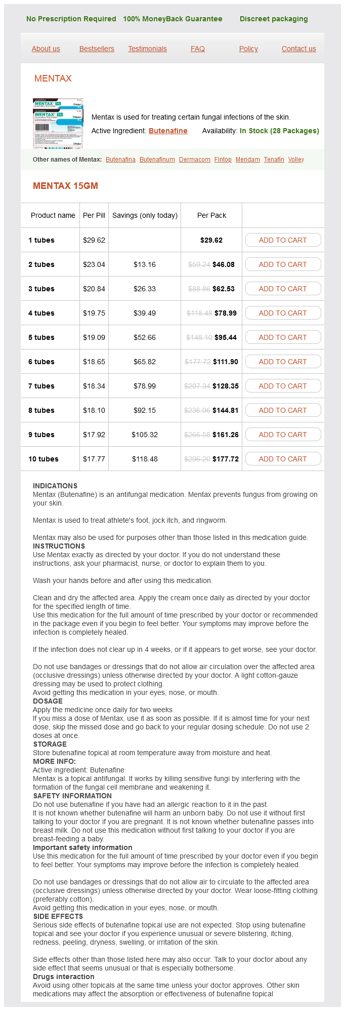 Clearly fungus killing trees mentax 15 mg order, if there are urinary symptoms, a digital assessment of the prostate is highly relevant, and similarly digital examination of the rectum (and, where relevant, vaginal examination) may be valuable in patients with pelvic or perineal symptoms. Digital examination of the rectum should be conducted, where possible, with the patient lying in the left lateral position, and should not be attempted until a full inspection of the perineum has been conducted to exclude fissure or other pathology which might give rise to severe pain on palpation. Initially, a digital assessment is made of anal sphincter tone, which may be increased in the presence of fissure and decreased in functional disorders such as anorectal incontinence. The differentiation may only be possible after sigmoidoscopy and histological examination. Sometimes, nearby extrarectal lymph nodes containing secondary tumour deposits may be palpable. Digital examination in these circumstances is usually accompanied by marked tenderness and pain. Anal neoplasms may extend from the anus and upwards into the rectum, in which case there may be a marked stenosis, and the examination will cause pain. A tender mass in the presence of oedematous rectal mucosa suggests a collection of pus, whereas a hard, fixed extrinsic mass in which there is no mobility of the rectal wall or uterus would be strong evidence in favour of pelvic malignancy. Infection may arise secondary to gynaecological or intestinal sepsis, but it may be secondary to an anal fistula where pus has tracked superiorly to create a collection above the levator musculature. Benign enlargement of the prostate may give rise to symmetrical hypertrophy of the gland in which the midline sulcus is preserved. Malignant enlargement gives rise to a mass that is denser and asymmetrical, and the midline sulcus is invaded. A mass that is clearly situated posterior to the rectum arises in the potential space ventral to the sacrum and coccyx bounded distally by the levator ani, and proximally by the pelvic peritoneal reflection. The important primary distinction is whether the lesion is solid or cystic; this may require ultrasound examination for confirmation. The majority of solid lesions are chordomas, and a cystic lesion is usually one of the following: (i) epidermoid cyst; (ii) mucussecreting cyst; (iii) teratoma; (iv) teratocarcinoma; or (v) meningocoele. Clinically, presacral masses usually present with a history of low back pain radiating to the rectum and buttocks. Pressure on the bladder may lead to urinary retention, and constipation is a frequent symptom. In the case of advanced malignancy, the rectal symptoms may be accompanied by constitutional symptoms, such as weight loss. Squamous carcinoma of the anal margin should be recognizable on simple inspection of the anal verge, and examination of the inguinal region may reveal lymphadenopathy in the presence of metastatic spread to the regional nodes. A similar condition has been described affecting micturition and is referred to as urinary tenesmus (or strangury). The repeated defecation is often accompanied by the passage of mucus and/ or blood, and this collection of symptoms should be distinguished from the symptom of diarrhoea.