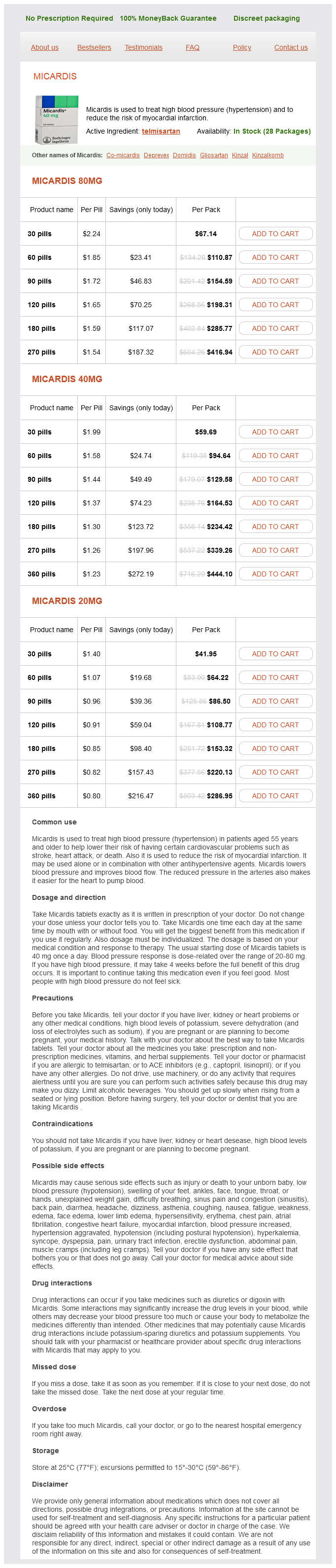 Micardis packs: 30 pills, 60 pills, 90 pills, 120 pills, 180 pills, 270 pills, 360 pills