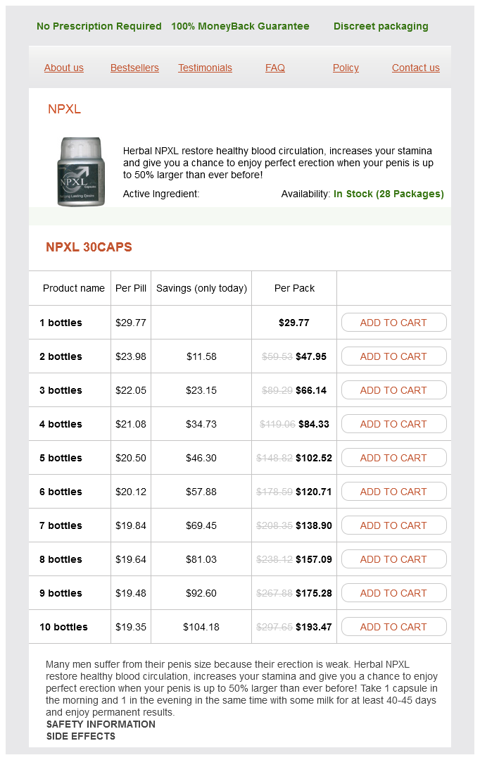 This is larger than the number of carbons in the molecule and would predict good water solubility herbals benefits order npxl 30 caps without a prescription, which is seen in experimental studies (20%). As will be seen, the absorption of compounds through cell monolayers is an important determinant of drug pharmacokinetics, and this factor can be altered by chemical synthetic alteration by a factor of approximately 50 in the drug development process. In contrast, aqueous solubility can be altered by far larger factors (up to a million-fold) 9. For the molecule shown, the score indicates a power to solubilize 9 carbon atoms; this is below the number of carbon atoms in the molecule; therefore, aqueous solubility would be predicted to be low (experimentally determined to be,0. Formation of a salt of this compound adds solubilizing power for 20À30 carbon atoms, making this molecule very water soluble. A special consideration in development is the delivery of very high doses of drug for toxicology testing. This is important because toxicology must be demonstrated to identify the risk and hazard associated with a new molecule, i. For toxicology testing, various cosolvents can be used to improve solubility; these would not be used therapeutically but could be a way to increasing absorption to show toxic effects. In general, as will be seen when cellular permeation is discussed, a delicate balance of aqueous and lipid solubility is required for the cellular penetration needed for adequate drug absorption. This classifies molecules in terms of their aqueous solubility and membrane permeation. Kinetic solubility measurements determine the amount of compound dissolved in water when added from a stock solution in dimethylsulfoxide. These measurements are rapid, are not made at equilibrium, and are useful for detecting absorption and bioassay liabilities. Another measurement, thermodynamic solubility, is made by equilibrating the solid with water for 24À72 hours and is used to guide formulation and in vivo studies. In light of the limited time window available for the intestinal absorption of oral drugs (approximately 4. Further discussion of the aqueous solubility of drugs can be found in Chapter 2, How Different Tissues Process Drug Response,Section 2. In general, water solubility is needed to carry the drug into the aqueous environment of the body and the cells within it. However, lipid solubility is also required in order to cross the bilipid membrane of the cell, so the ideal drug would have enough hydrophobicity to pass through the lipid bilayer but not so much as to cause the molecule to be unable to partition out again. Drug hydrophobicity can affect the way that the drug distributes and is metabolized and excreted in the body. Specifically, hydrophobic drugs are generally more toxic and widely distributed, have less selective binding, are more extensively metabolized to reactive metabolites, and are retained for longer periods in the body. There are data to show that excessively high molecular weight compounds are poorly absorbed; therefore, it is advantageous to keep this parameter between 250 and 350 g/M. This may be difficult, since enhancement of biological activity from the original hit found in a screening program usually entails adding chemical groups to the molecule, not removing them. There are molecules which contain a chiral center (a carbon with four different attachments), and those molecules with different chiral centers (to which the groups are attached in different orientations) are nonsuperimposable.
