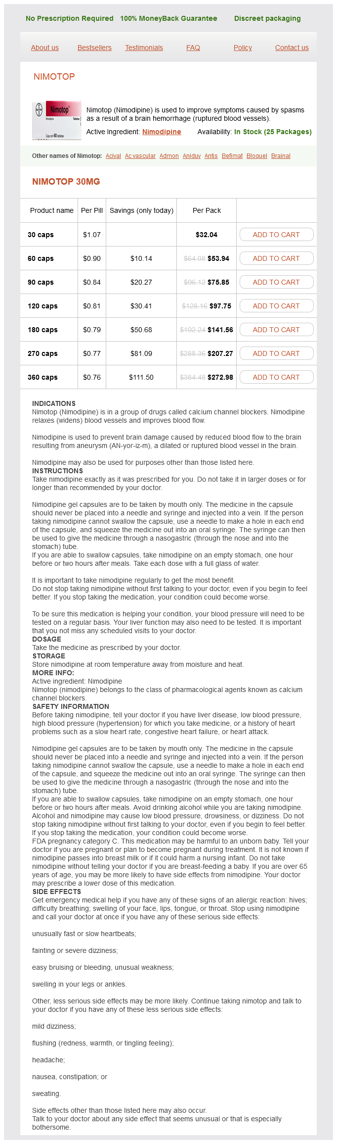 Nimotop packs: 30 caps, 60 caps, 90 caps, 120 caps, 180 caps, 270 caps, 360 caps