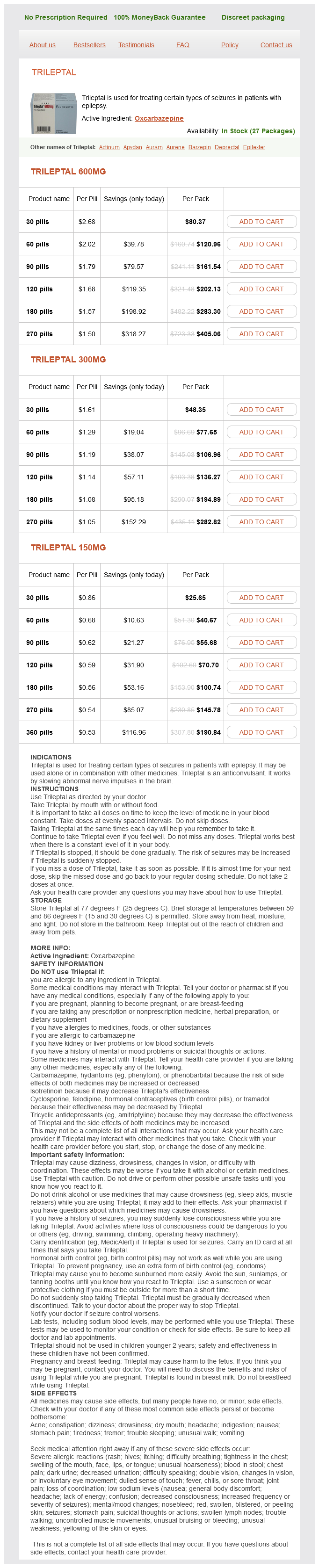 Oxcarbazepine packs: 30 pills, 60 pills, 90 pills, 120 pills, 180 pills, 270 pills, 360 pills
