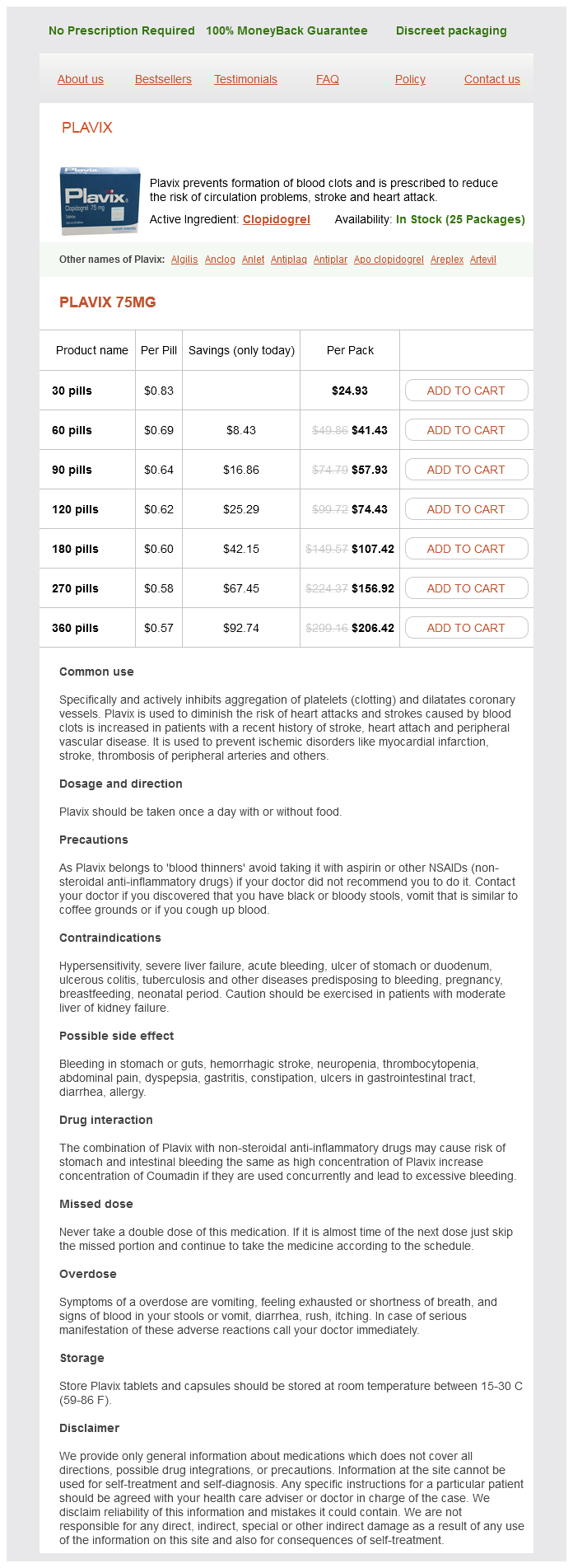 Plavix packs: 30 pills, 60 pills, 90 pills, 120 pills, 180 pills, 270 pills, 360 pills