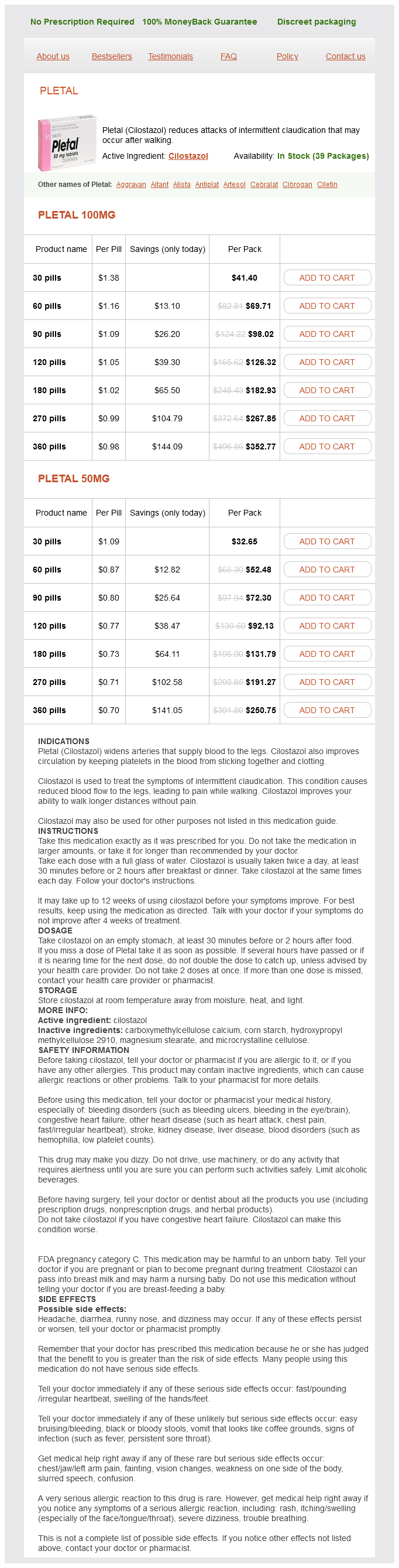 Pletal packs: 30 pills, 60 pills, 90 pills, 120 pills, 180 pills, 270 pills, 360 pills