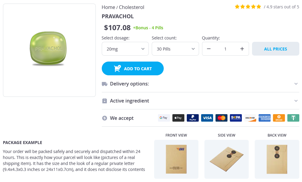 Pravachol packs: 30 pills, 60 pills, 90 pills, 120 pills, 180 pills, 270 pills