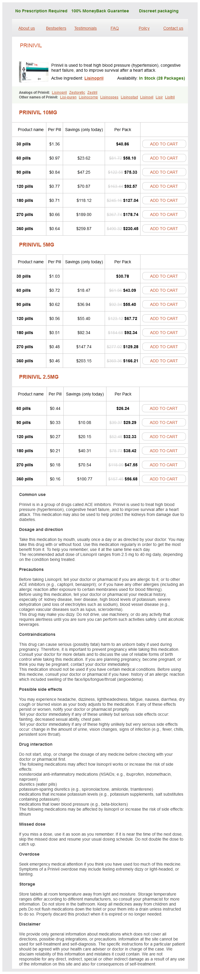 Prinivil packs: 30 pills, 60 pills, 90 pills, 120 pills, 180 pills, 270 pills, 360 pills
