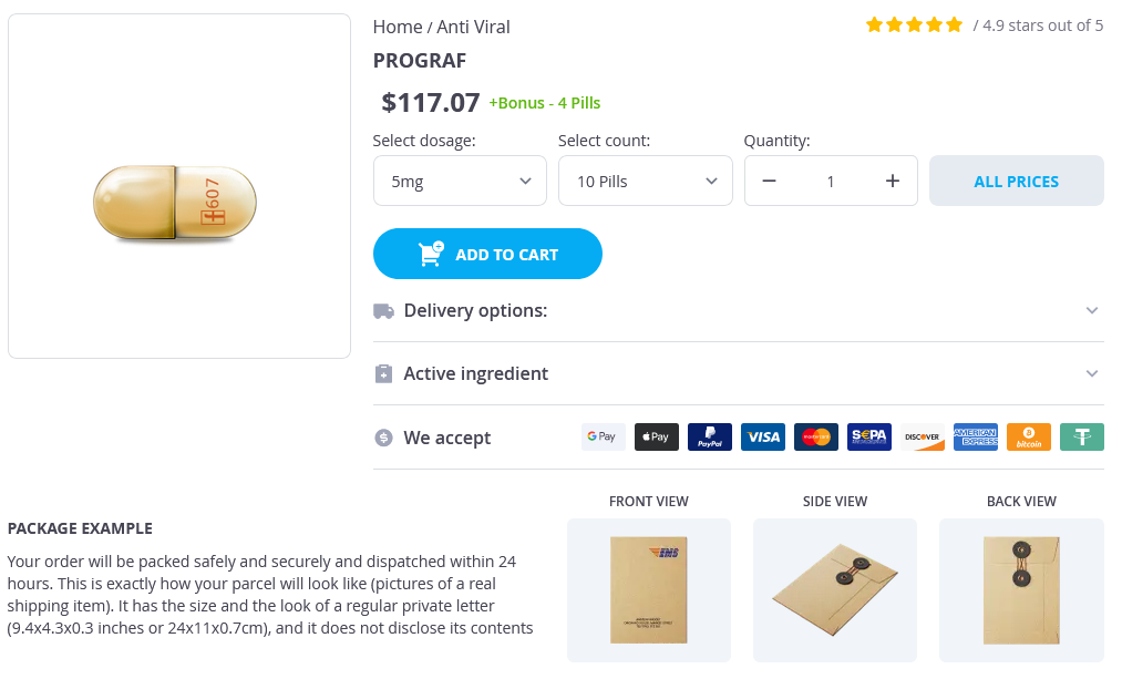Prograf packs: 10 pills, 20 pills, 30 pills, 40 pills, 50 inhalers, 60 pills, 80 pills