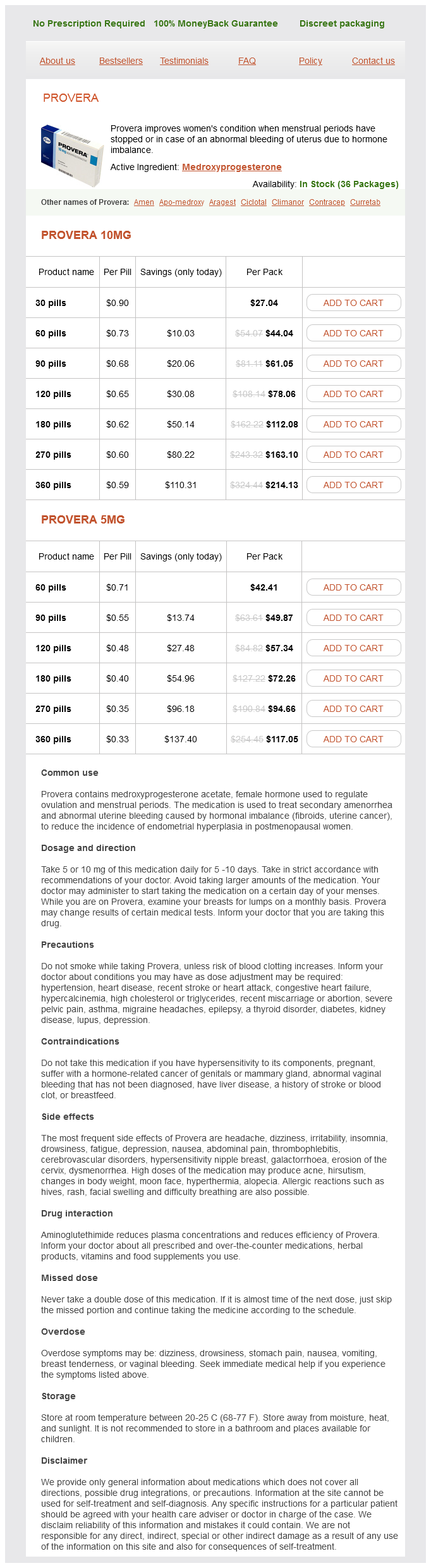 Provera packs: 30 pills, 60 pills, 90 pills, 120 pills, 180 pills, 270 pills, 360 pills