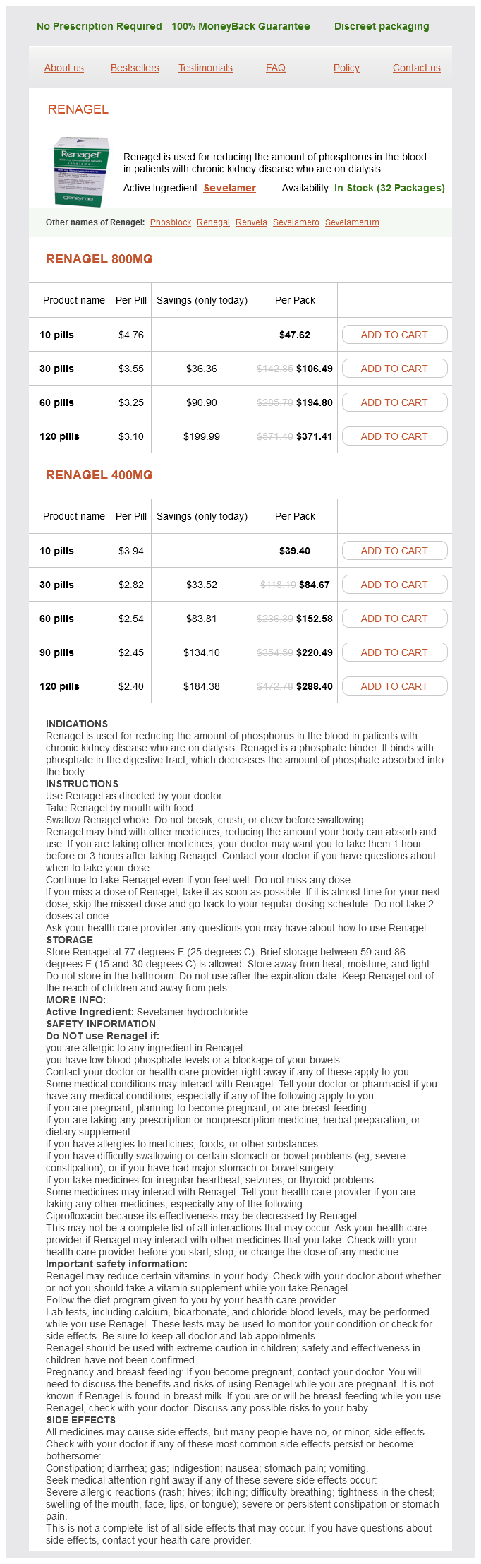 Renagel packs: 10 pills, 30 pills, 60 pills, 120 pills, 90 pills