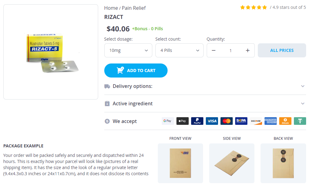 Rizact packs: 4 pills, 8 pills, 12 pills, 24 pills, 32 pills, 48 pills