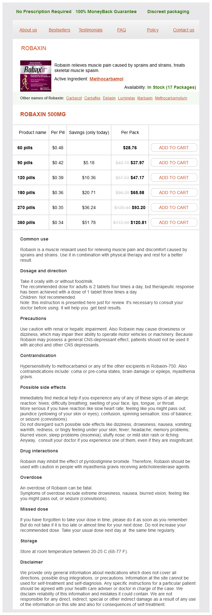 Robaxin packs: 60 pills, 90 pills, 120 pills, 180 pills, 270 pills, 360 pills