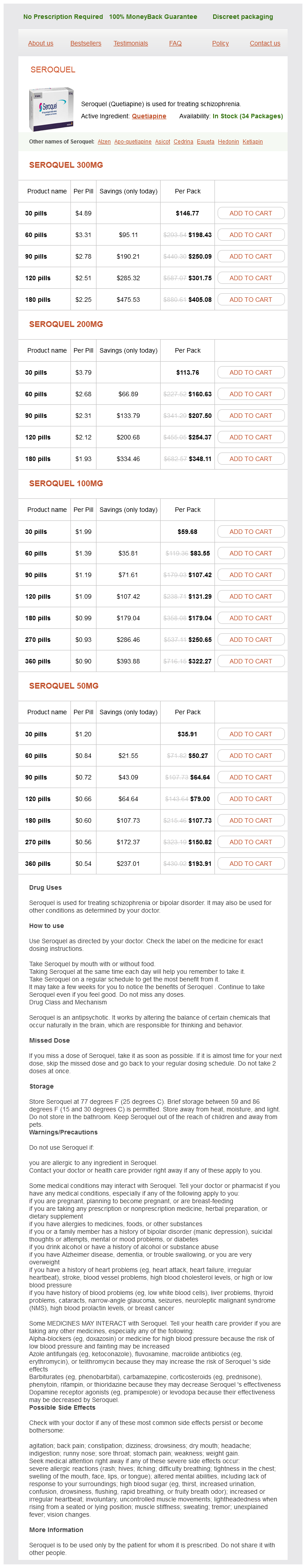Seroquel packs: 30 pills, 60 pills, 90 pills, 120 pills, 180 pills, 270 pills, 360 pills