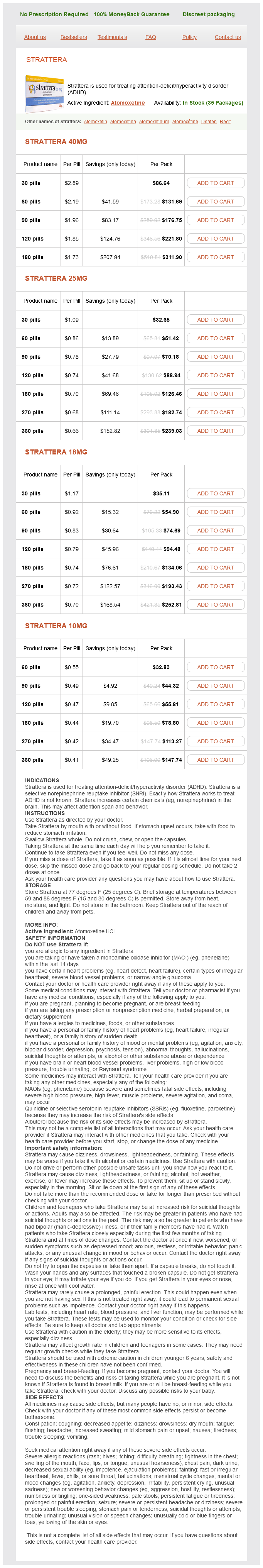 Strattera packs: 30 pills, 60 pills, 90 pills, 120 pills, 180 pills, 270 pills, 360 pills