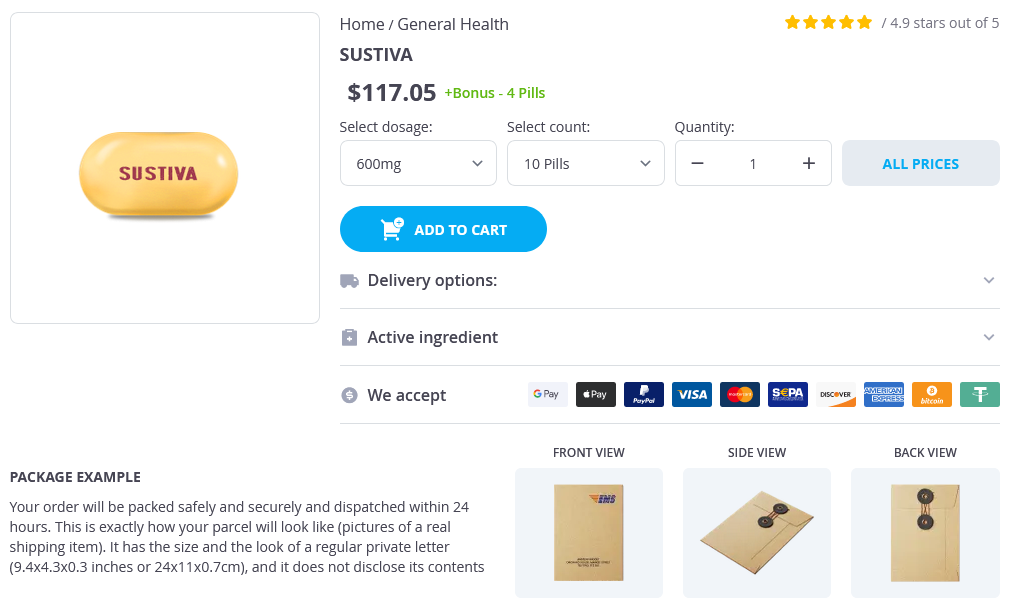 Sustiva packs: 10 pills, 20 pills, 30 pills, 60 pills, 90 pills, 120 pills