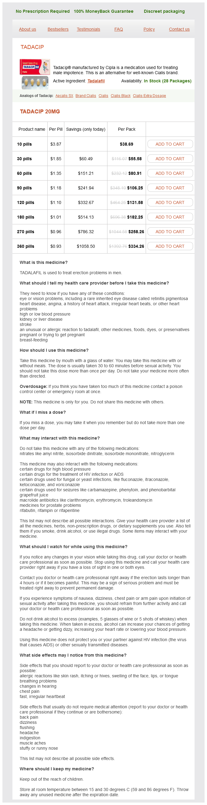 Tadacip packs: 10 pills, 30 pills, 60 pills, 90 pills, 120 pills, 180 pills, 270 pills, 360 pills
