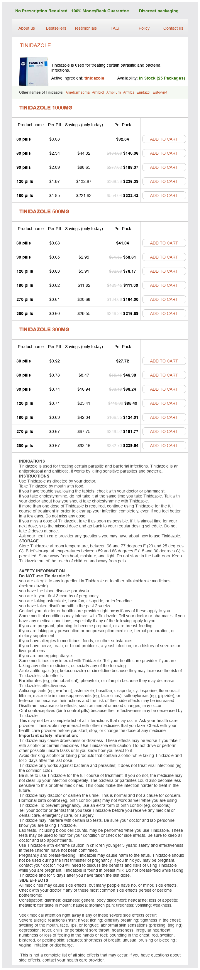 Tinidazole packs: 30 pills, 60 pills, 90 pills, 120 pills, 180 pills, 270 pills, 360 pills