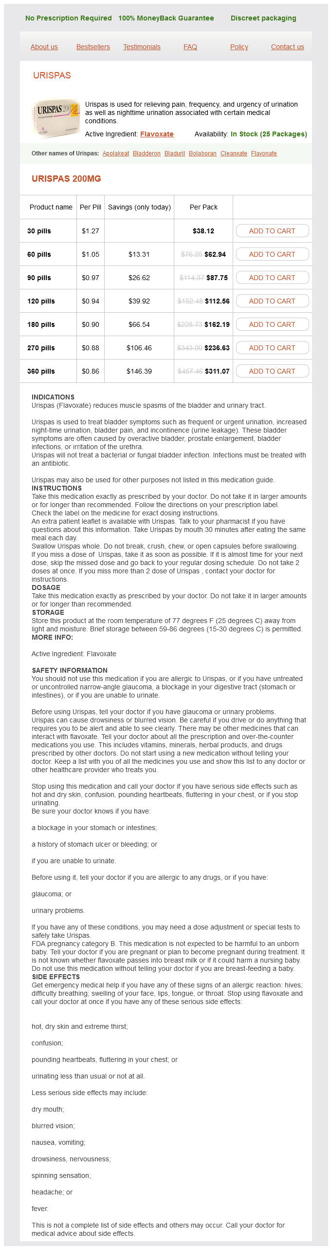 Urispas packs: 30 pills, 60 pills, 90 pills, 120 pills, 180 pills, 270 pills, 360 pills