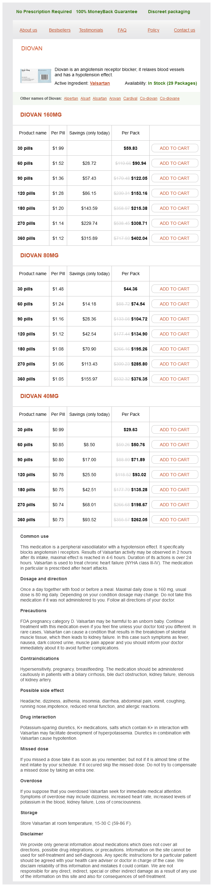 Valsartan packs: 30 pills, 60 pills, 90 pills, 120 pills, 180 pills, 270 pills, 360 pills