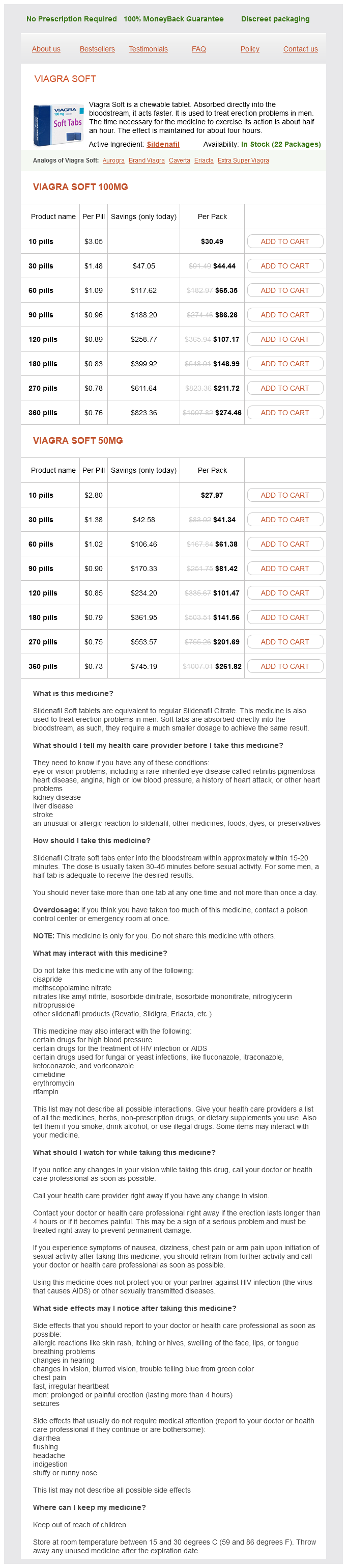 Viagra Soft packs: 10 pills, 30 pills, 60 pills, 90 pills, 120 pills, 180 pills, 270 pills, 360 pills