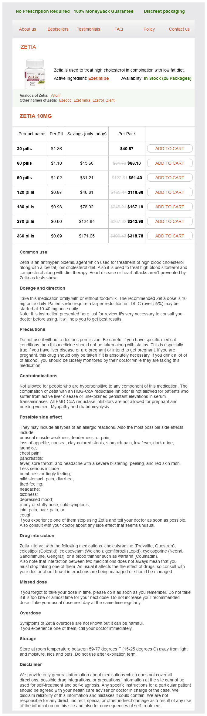 Zetia packs: 30 pills, 60 pills, 90 pills, 120 pills, 180 pills, 270 pills, 360 pills