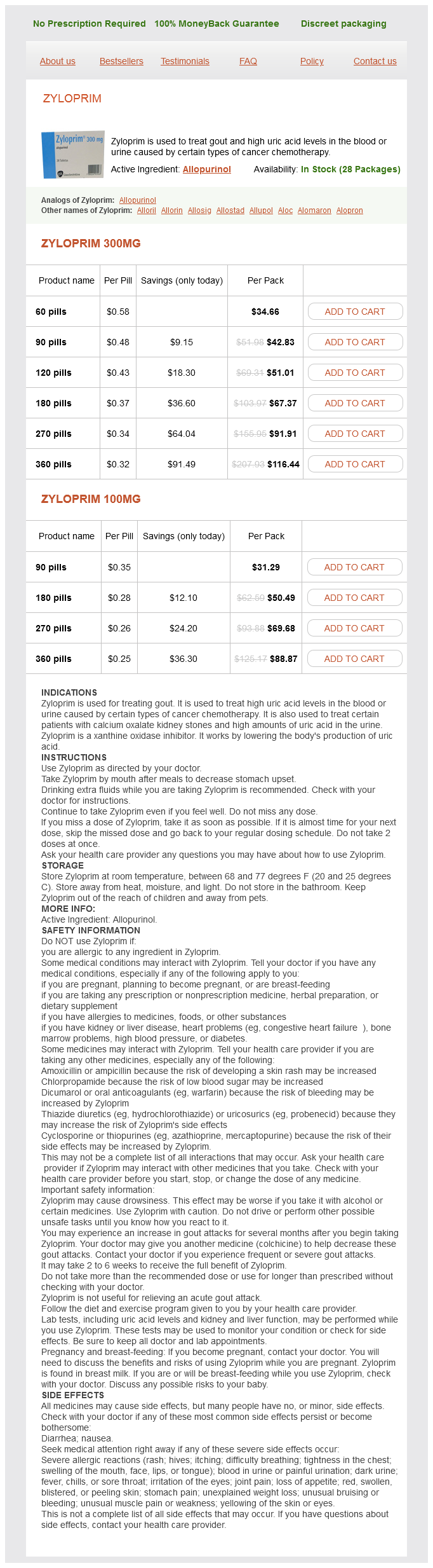 Zyloprim packs: 60 pills, 90 pills, 120 pills, 180 pills, 270 pills, 360 pills