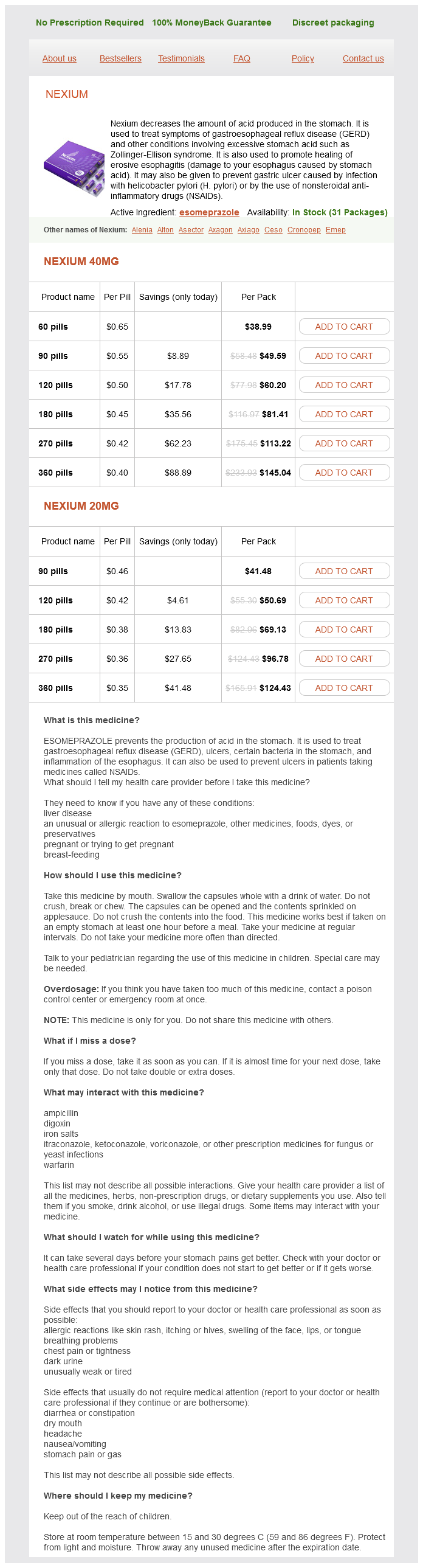 None of the devices completely eliminated urine leakage when applied at a comfortable pressure gastritis reviews esomeprazole 20 mg sale. Complications of penile clamps can include edema gastritis diet ìòñ proven esomeprazole 40 mg, pain gastritis hiatal hernia diet buy on line esomeprazole, urethral erosion gastritis daily diet discount esomeprazole 20 mg visa, and obstruction gastritis diet èíñòàãðàìì purchase esomeprazole 20 mg amex. Immunohistochemical analysis of chromophobe renal cell carcinoma, renal oncocytoma, and clear cell carcinoma: An optimal and practical panel for differential diagnosis. A 7-question validated questionnaire to assess the impact of female urinary incontinence on activities of daily living. Commonly used in a perioperative setting for patients undergoing anti-incontinence procedures and for research purposes. The term climacturia is used mostly when referring to males who have incontinence associated with orgasm; this condition is seen mostly after radical prostatectomy. Testicular histology varies from complete absence of germinal elements to maturation arrest of spermatogenesis. Patients can present with flank pain, hematuria, or deterioration of global kidney function. Indications for surgery include obstruction or to allow access to treat stones in an obstructed calyx. Pecutaneous renal surgery: Use of flexible nephroscopy and treatment of infundibular stenosis. The inflammatory response in ulcerative colitis is mostly confined to the mucosa and submucosa, as opposed to Crohn disease, which can be transmural. These diseases can give rise to a number of urologic manifestations including fistula to the urinary tract, malabsorption syndromes leading to nephrolithiasis, and pyoderma gangrenosum of the genitalia (Image). The overactive bladder-symptom composite score: A composite symptom score of toilet voids, urgency severity and urge urinary incontinence in patients with overactive bladder. The differential diagnosis of benign inflammatory pseudotumors primarily includes the spindle variant of carcinoma and sarcomas. Immunohistochemical stains are used to distinguish spindle variants of carcinoma from benign inflammatory pseudotumors. These can be seen endoscopically as pedunculated nonpapillary intraluminal lesions or as difficult to identify submucosal lesions. Management is by compete transurethral resection as inflammatory pseudotumors are benign lesions that grow slowly and do not metastasize or undergo malignant transformation. It occurs when there is a protrusion of intra-abdominal contents in an area called the Hesselbach triangle (formed by the rectus abdominis muscle, inferior epigastric artery, and inguinal ligament). In cases of a large inguinal hernia, a portion of a distended bladder can herniate into the groin. Indirect inguinal hernias are more common in infants and children and are caused by a patent processus vaginalis. Modifications included detubularizing the colon with subsequent closure in a HeinekeÂMikulicz configuration, strengthening of the ileocecal valve with imbricating sutures (which are performed on the ileal limb), and then performing a tunneled ureterocolonic anastomosis (Image). During embryologic development, the spermatic cord and testis descend through the anterior abdominal wall to the inguinal canal through the projection of the process vaginalis. If the process vaginalis persists, an indirect inguinal hernia may form and is always associated with a hydrocele. The primary principle behind injection therapy is to endoscopically inject a bulking agent beneath the ureteral orifice, which then helps to coapt the distal ureter. The objective is to create a "volcano" like mound appearance of the ureteral orifice. Agents used for endoscopic correction of ureteral reflux should be nontoxic, cause minimal local inflammation, not migrate to other organs, and should be easy to inject. Broadly they can be categorized into 2 main categories: Nonautologous and autologous. Chondrocytes, fat, collage, and muscles are some of the autologous materials that have been used (Image). With good-risk disease, the goal is to minimize the toxicity of current regimens, while preserving the high cure rates. In patients with high-risk disease, investigational studies have been designed to improve long-term response rates. Survival in >5,200 patients is correlated with risk status: Good-risk disease, 91% 5-yr survival; intermediate-risk disease, 79% 5-yr survival; poor-risk disease, 48% 5-yr survival. Treatment of prostate cancer with intermittent versus continuous androgen deprivation: a systematic review of randomized trials. Intermittent androgen deprivation therapy for prostate cancer: Translating randomized controlled trials into clinical practice. These generally apply to children who are 5 or more years of age (unless noted otherwise). Hesitancy can be applied to children who have achieved bladder control regardless of age. These may be observed in children who have achieved bladder control regardless of age. While this is a benign process requiring only analgesics and antihistamines for its treatment, it is imperative to rule out pathologic events such as testicular torsion or cancer. The management and survival of patients with advanced germ-cell tumours: Improving outcome in intermediate and poor prognosis patients. The symptoms are scored from mild (0Â7), moderate (8Â19), to severe (20Â35); the score can also be used to measure treatment response. Discontinuation of tamsulosin appears to be unpredictable and may not reliably reduce the severity. To mitigate the intraoperative problems, pharmacologic and mechanical strategies are used. Does evaluation with the International Prostate Symptom Score predict the outcome of transurethral resection of the prostate Nonspecific symptoms and signs, along with acute renal dysfunction include nausea, vomiting, and malaise. With drug-related interstitial nephritis, allergic-type react