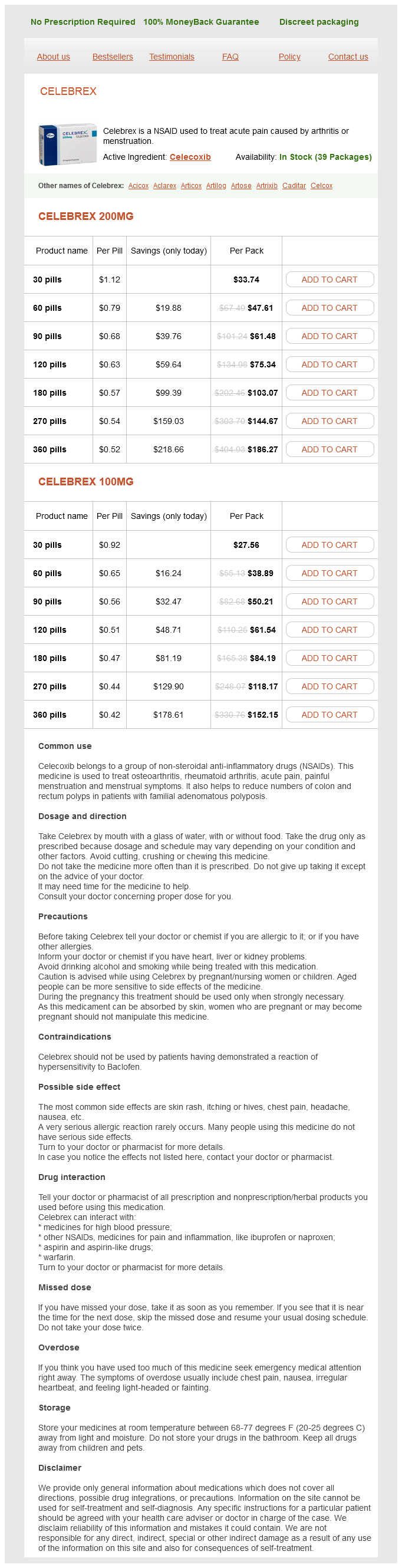Abuse of the drug or other substances may lead to severe psychological or physical dependence rheumatoid arthritis diet study order celecoxib overnight. Abuse of the drug or other substance may lead to moderate or low physical dependence or high psychological dependence arthritis pain.org generic celecoxib 200 mg buy on-line. Each state has the opportunity to modify current drug laws according to its own needs and preferences rheumatoid arthritis knee exercises 200 mg celecoxib buy with amex. For example arthritis in the feet signs and symptoms purchase celecoxib american express, marijuana is classified as a Schedule I substance arthritis pain medication for cats 100 mg celecoxib order with amex, but the penalties for possession in many states are less severe than those applied to other Schedule I substances. In fact, a number of states at some time have passed legislation to decriminalize, and in some recent cases to outright legalize, marijuana possession. It is important to recognize that new legislation is always on the horizon, whether in response to the latest trends in drug use and abuse or reflecting emergent political mandates. During the 1980s, law enforcement agencies were having difficulties controlling the production of the so-called designer drugs- drugs that were structurally similar but not identical to illegal substances. Each time a slight modification in the chemical structure of a drug was made, enforcement officials were forced to go through a time-consuming process of documenting the drug and having it certified as a controlled substance. In response, in 1986, Congress passed the Controlled Substances Analogue Enforcement Act, which allowed for the immediate classification of a substance as a controlled substance. In this way, drug enforcement officials were in a better position to address a new drug as soon as it appeared in circulation. Similarly, legislation has been put in place to allow the Drug Enforcement Administration to monitor and regulate the distribution of chemical substances and other equipment needed for the preparation of illegal drugs. Titled the Chemical Diversion and Trafficking Act of 1988, this legislation controls the distribution of particular chemicals, tabulating machines, and encapsulating machines that are used in the manufacture of illicit substances. In 1996, the Comprehensive Methamphetamine Control Act was enacted to curb the "The solution to our drug problem is not in incarceration. In 1999, chemicals used as "date rape" drugs were added to Copyright 2019 Cengage Learning. Hallmark features of this "war" are efforts to catch drug smugglers and sellers (in this country and overseas) and the implementation of a "zero-tolerance" approach to drug users, including casual users of drugs. Hundreds of millions of dollars have been spent on these efforts, yet the flow of drugs into the United States has not been significantly altered. Some organizations, such as the Physician Leadership on National Drug Policy, have been pushing for a greater focus on reducing the demand for drugs through prevention efforts and treatment (including the use of treatment services as an alternative to incarceration). This emphasis on demand reduction appears to reflect the attitudes of most individuals as well. Instead, changes in the "battle plan" will reflect shifts in focus, such as paying more attention to policing drug supply routes than to drug demand, or vice versa. Overall efforts continue to be coordinated by the head of the White House Office of National Drug Control Policy, better known as the "drug czar. It is noteworthy that the two drugs most associated with deaths in this country-tobacco and alcohol-are not a focus of attention in any of these efforts. A likely candidate for upcoming legislation is salvia divinorum, a hallucinogenic member of the sage family. Known as "magic mint" or "Sally-D," salvia has been used historically by Mazatec Indians in Mexico for ailments such as diarrhea, headaches, and rheumatism and for interacting with the supernatural world. Although salvia is legal to buy, sell, and smoke in most states, concerns over its use, growing popularity, and effects have led a rapidly growing number of states and also other countries to restrict or criminalize the sale and possession of salvia. The Drug Enforcement Administration is considering classifying salvia as a controlled substance, and such an action appears likely in the near future. These include the banning of candyflavored cigarettes (within 3 months of the passage of the law), the banning of the marketing of cigarettes as "light," "mild," or "low-tar" (within 12 months), implementing stronger warnings on smokeless tobacco products that will cover 30% of the front and back package panels (within 12 months), and graphic warnings on cigarette packages covering 50% of the top front and top back of "[Drug control efforts] have had harmful collateral consequences: creating a criminal black market; fuelling corruption, violence, and instability; threatening public health and safety; generating large-scale human rights abuses, including abusive and inhumane punishments; and discrimination and marginalization of people who use drugs, indigenous peoples, women, and youth. One result of the concern over drug use and misuse has been efforts by corporations to have their workers submit to mandatory drug tests. Employers argue the tests are needed to identify those workers who, because of their drug use, may be at risk for subpar or even dangerous work performance. The argument employers put forth may appear relatively straightforward: If drugs can impair work performance, then checking for drugs is a legitimate practice. First is the possible infringement on constitutional rights of privacy when tests are administered randomly (that is, without warning and independent of "probable cause"). This concern has led some to suggest that tests should be used only if a demonstrable "reasonabl