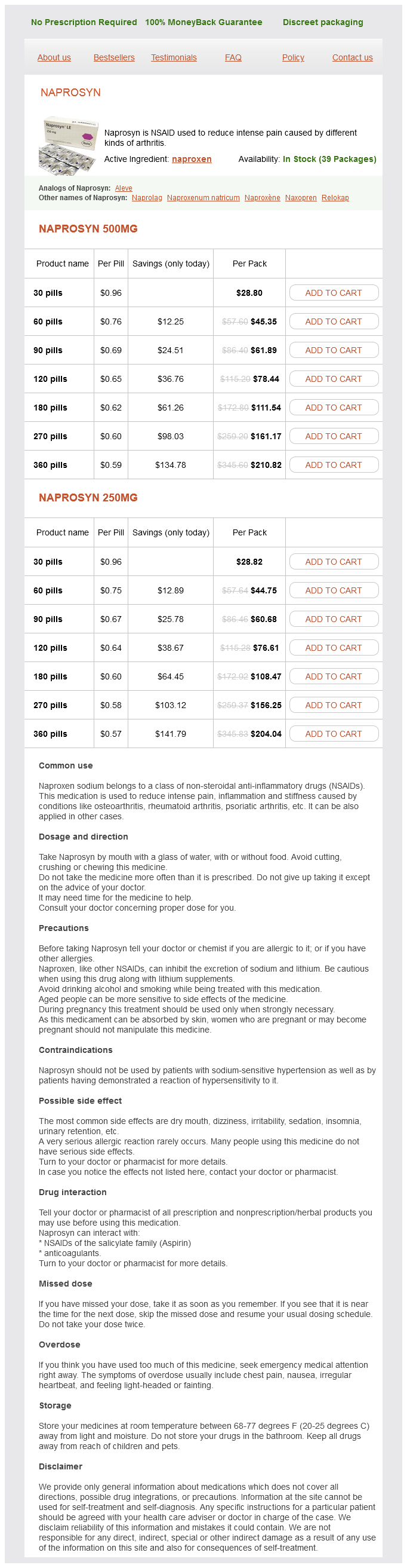 Patient with two secondary somatic-type malignancies in a late recurrence of a testicular nonseminoma: illustration of potential and flaw of the cancer stem cell therapy concept arthritis medication for back pain discount naproxen 250 mg line. Cytoreductive surgery for metastatic testis cancer: tissue analysis of retroperitoneal masses after chemotherapy arthritis diet related discount naproxen line. Surgical resection in disseminated testicular cancer following chemotherapeutic cytoreduction arthritis in the knee running naproxen 500 mg buy on-line. Thoracic metastasectomy for germ cell tumours: long term survival and prognostic factors arthritis pain relief daily express best order naproxen. Outcome analysis for patients with persistent nonteratomatous germ cell tumor in postchemotherapy retroperitoneal lymph node dissections oligoarticular arthritis definition discount 500 mg naproxen visa. Spermatocytic seminoma: A report of 85 cases emphasizing its morphologic spectrum including some aspects not widely known. Reactivity of germ cell maturation stage-specific markers in spermatocytic seminoma: diagnostic and etiological implications. Intermitochondrial cement (nuage) in a spermatocytic seminoma: comparison with classical seminoma and normal testis. A case report with light microscopic, ultrastructural, and immunohistochemical findings. Therapy-resistant metastasizing anaplastic spermatocytic seminoma: a cytogenetic hybrid: a case report. Testicular and paratesticular pathology in the pediatric population: a 20 year experience at Riley hospital for children. Recent advances in understanding the etiology and pathogenesis of pediatric germ cell tumors. A case of immature teratoma originating in intra-abdominal undescended testis in a 3month-old infant. Renal cell carcinoma metastatic to the testis and its adnexa: a report of five cases including three that accounted for the initial clinical presentation. Testis-sparing surgery for a post-pubertal testicular dermoid cyst: a case report and literature review. Testicular epidermoid cysts in children: sonographic characteristics with pathological correlation. Interphase fluorescence in situ hybridization analysis of chromosome 12p abnormalities is useful for distinguishing epidermoid cysts of the testis from pure mature teratoma. The role of testis-sparing surgery in children and adolescents with testicular tumors. Primary carcinoid tumor of the testis: case report, ultrastructure and review of the literature. Immunohistochemical demonstration of multiple neurohormonal polypeptides in a case of pure testicular carcinoid. Atlas of Tumor Pathology: Tumors of the Testis, Adenexa, Spermatic Cord and Scrotum. Pure cartilaginous teratoma of the testis: an immunohistochemistry and fluorescence in situ hybridisation study. Pediatric testicular tumors: contemporary incidence and efficacy of testicular preserving surgery. Yolk sac tumor of the testis in infants and children: a clinicopathologic analysis of 33 Cases. Juvenile granulosa cell tumors of the testis: a clinicopathologic study of 70 cases with emphasis on its wide morphologic spectrum. The stage I yolk sac tumor of testis in children younger than 2 years, chemotherapy or not Leydig cell tumor of the testis with histological and immunohistochemical features of malignancy in a 1-year-old boy with isosexual pseudoprecocity. Characteristics of patients with Sertoli and Leydig cell testis neoplasms from a national population-based registry. Familial occurrence of Leydig cell tumors: a report of a case in a father and his adult son. Adult leydig cell tumors of the testis caused by germline fumarate hydratase mutations. Leydig-cell tumors caused by an activating mutation of the gene encoding the luteinizing hormone receptor. Leydig cell tumors of the testis with unusual features: adipose differentiation, calcification with ossification, and spindle-shaped tumor cells. Inhibin A is a sensitive and specific marker for testicular sex cord-stromal tumors. Immunohistochemical study of testicular sex cord-stromal tumors, including staining with anti-inhibin antibody. Immunoreactivity for A103, an antibody to melan-A (Mart-1), in adrenocortical and other steroid tumors. Calretinin: a valuable marker of normal and neoplastic Leydig cells of the testis. Cellular proliferation and nuclear ploidy assessments augment established prognostic factors in predicting malignancy in testicular Leydig cell tumours. Leydig cell tumor of the testis: comparison of histopathological and immunohistochemical features of three azoospermic cases and one malignant case. Cellular differentiation in ovarian sex-cord-stromal and germ-cell tumors studied with antibodies to intermediate-filament proteins. Twenty-nine Leydig cell tumors: histological features, outcomes and implications for management. Stromal testis tumors in children: a report from the prepubertal testis tumor registry. Pathologic risk factors for metastatic disease in postpubertal patients with clinical stage i testicular stromal tumors. Organ-sparing surgery for adult testicular tumours: a systematic review of the literature. Testis sparing surgery for treatment of small testicular lesions: Is it feasible even in germ cell tumors Does retroperitoneal lymph node dissection have a curative role for patients with sex cord-stromal testicular tumors A report of six cases and review of the literature on testicular masses in patients with adrenocortical disorders. Rete testisassociated nodular steroid cell nests: description of putative pluripotential testicular hilus steroid cells. Large-cell calcifying Sertoli cell tumor of the testis: light microscopic and ultrastructural study. Large cell calcifying Sertoli cell tumor of the testis: comparative immunohistochemical study with Leydig cell tumor. Testicular Sertoli cell tumor with a heterologous sarcomatous component: immunohistochemical assessment of Sertoli cell differentiation. Sclerosing Sertoli cell tumor of the t