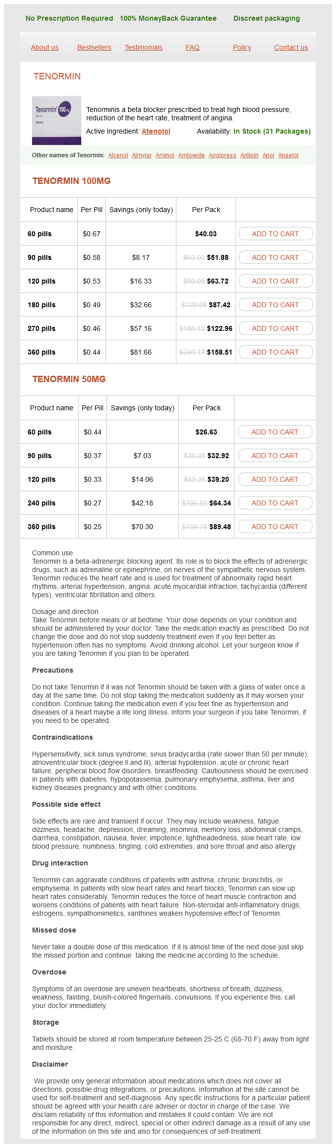 The Normal Tone feature uses a proprietary algorithm that will provide pulse tones during non motion and adequate perfusion conditions prehypertension prevalence buy discount atenolol 50 mg on-line. Oxyhemoglobin (oxygenated blood), deoxyhemoglobin (non-oxygenated blood), carboxyhemoglobin (blood with carbon monoxide content), methemoglobin (blood with oxidized hemoglobin) and blood plasma constituents differ in their absorption of visible and infrared light (using spectrophotometry, see figure below) prehypertension occurs when 100 mg atenolol order with mastercard. The amount of arterial blood in tissue changes with your pulse (photoplethysography) blood pressure chart emt cheap atenolol 100 mg on-line. Therefore, the amount of light absorbed by the varying quantities of arterial blood changes as well blood pressure chart young adults discount atenolol 50 mg overnight delivery. The detector receives the light, converts it into an electronic signal and sends it to the Rad-57 for calculation arterial nicking cheap atenolol 100 mg. The maximum of the skin surface temperature is measured at an ambient temperature of less than 106º F (41º C). Fractional Saturation the Rad-57 is calibrated to measure and display functional saturation (SpO2): the amount of oxyhemoglobin expressed as a percentage of the hemoglobin that is available to transport oxygen. Note that carboxyhemoglobin is not capable of transporting oxygen, but is recognized as oxygenated hemoglobin by conventional pulse oximetry. As blood samples are usually taken over a period of 20 seconds (the time it takes to draw the blood) a meaningful comparison can only be achieved if the oxygen saturation, carboxyhemoglobin and methemoglobin concentration of the patient are stable and not changing over the period of time that the blood gas sample is taken. Additionally, drawn, whole-blood testing can be affected by sample handling methods and time elapsed between blood draw and sample testing. Conventional pulse oximeters assume that arterial blood is the only blood moving (pulsating) in the measurement site. During patient motion, however, the non-arterial blood also moves, causing conventional pulse oximeters to read low values, because they cannot distinguish between the arterial and venous blood movement (sometimes referred to as noise). Adaptive filters are powerful because they are able to adapt to the varying physiologic signals and/or noise and separate them by looking at the whole signal and breaking it down to its fundamental components. However, because of the changes in the physiological parameters such as blood volume, arterial-venous coupling, etc. All pulse oximetry measurement information, as well as instrument status data, is displayed on the front panel of the instrument. All user input is handled by control buttons on the front panel and the sensor cable connection is located at the top edge of the instrument. Rad-57 supports the full line of Masimo sensors (see Section 8, Sensors and Patient Cables). A Direct Connect Rainbow reusable sensor or patient cable or a Direct Connect Red reusable sensor or patient cable attaches to the patient cable connector on the top of the Rad-57 Instrument. Used to enter the setup menus and to select/activate certain entries within the menu/setup system. Ensure the speaker is not covered or the Instrument is placed face-down on bedding or other sound absorbing surface. Displays parameter/measurement numeric values and indicates parameter/measurement label. The Perfusion Index provides an indication of the percentage of pulsatile signal to non pulsatile signal. Push a second time to return the Instrument to standard alarm monitoring During saturation monitoring, use these buttons to adjust the volume of the pulse beep tone. Within the menu/setup system, these buttons are used to select values within each menu option. Do not use any other type of batteries or 5 10 15 20 25 power source to run the instrument. To install the batteries first remove the battery cover by depressing the small 10 15 20 25 the rectangular button at the bottom15 the cover, and sliding the 25 down off the bottom of the of cover 5 10 20 instrument. All four indicators will be lit when the batteries are full, with fewer indicators being lit as the batteries lose their charge. When the battery life is low, the battery indicator will begin to flash and an audible alarm will sound. Unpacking and Inspection Remove the instrument from the shipping carton and examine for signs of shipping damage. The contact address and phone numbers are listed in Section 9, Service and Maintenance. Configure the Instrument for your regional power line frequency (50 or 60 Hz) if needed. Refer to Section 4, General Setup and Use for additional steps to verify proper functioning of the Instrument. Understand its status and alarm messages (see Section 5, Alarms and Messages and Section 6, Troubleshooting). If utilizing a patient cable, select a sensor that is compatible with the Instrument and the patient before connecting it to the cable. If using a single patient adhesive or disposable sensor, check that the emitter (red light) and the detector are properly aligned. Verify all front-panel indicators momentarily illuminate and an audible tone is heard 8. Verify the front-panel display is free of alarm and system failure messages (see Section 5, Alarms and Messages) and the battery indicator shows sufficient charge (see Section 4, Battery Level Indicator). Verify that the patient alarms are functional by setting the high and low SpO2 and pulse rate alarm limits beyond the patient readings. Verify the sensor alarms are functional by removing the sensor from the sensor site. Create an alarm condition by lowering the SpO2 or pulse rate high alarm limits beyond the patient readings. Verify the sensor is applied correctly and that the measured data is appropriate, see Section 4, Successful SpO2 Monitoring. After monitoring is complete, remove the 