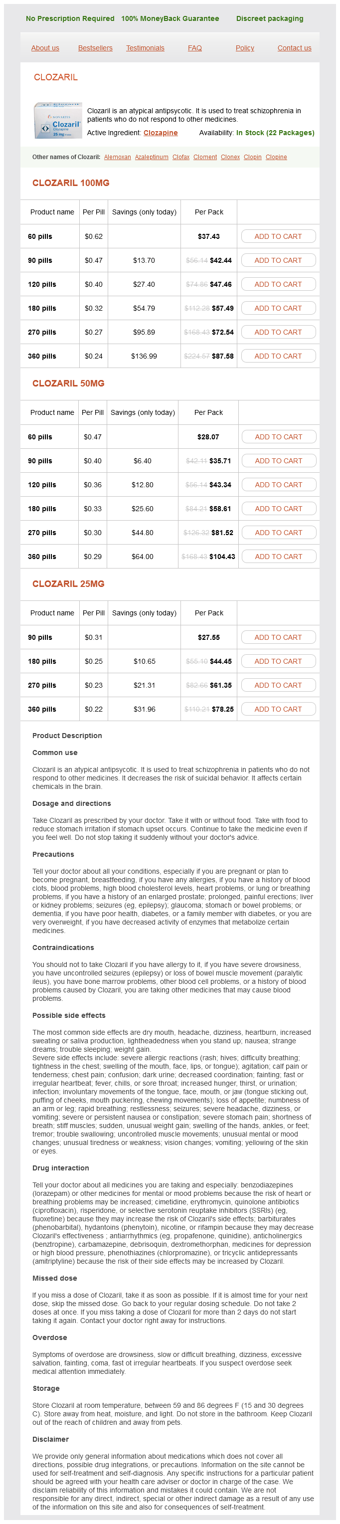 Consistent with these data great depression definition apush buy generic clozapine from india, findings from one large meta-analysis of 734 patients demonstrated that an elevated D-dimer level had a 97% sensitivity and 96% negative predictive value for identifying acute aortic dissection jung depression test generic clozapine 100 mg buy online. Conversely jung depression test clozapine 100 mg purchase mastercard, an elevated D-dimer is less effective at "ruling-in" aortic dissection mood disorder nos dsm code order genuine clozapine, with a specificity of 56% and positive predictive value of 60% depression chemical imbalance test discount clozapine 50 mg with visa. Associated findings may include cardiomegaly (pericardial effusion) and pleural effusion (left > right). Effusions that occupy more than 50% of the chest cavity may be indicative of rupture with hemothorax. Additional findings include displacement of intimal calcium, delayed contrast enhancement of the false lumen, and aortic widening. Branch vessel involvement anywhere along the course of the aorta to the level of the iliac arteries can be precisely displayed. Motion artifact, mural thrombi, and image artifacts may negatively affect study accuracy. B, 3D reconstruction imaging in same patient provides enhanced spatial resolution after surgical repair of aortic dissection and surrounding anatomical structures. Intravascular ultrasound is infrequently used as a second imaging technique for diagnosis in patients for whom false-negative results on invasive aortography are suspected, and femoral access has been obtained. Intravascular ultrasound may also have a role during performance of endovascular procedures. Systematic preoperative coronary angiography for hemodynamically stable chronic type A dissection patients is a subject of debate. Identification of high-grade atherosclerotic disease of native coronary arteries and/or coronary artery bypass graft(s) affords determination of the optimal operation for patients requiring ascending aortic surgery. However, in these instances, the potential for incorporating additional surgical procedures beyond repairing the dissection should be evaluated on a case-by-case basis. Surgery or endovascular stent grafting when feasible can be undertaken for failed medical therapy, pseudoaneurysm, or rupture. Differential Diagnosis Other Acute Aortic Syndromes Aortic transection from deceleration injury and traumatic aortic valve disruption with acute severe aortic regurgitation occur in the setting of high-speed vehicular accidents or vertical falls. The nontraumatic acute aortic syndromes, however, are often not distinguishable from classic dissection on clinical grounds alone, but rather are delineated with cross-sectional imaging. Predicting evolution to dissection, rupture, aneurysm formation, or false aneurysm development is difficult. Imaging studies in the former disease states may reveal wall thickening and periaortic stranding or hematoma, as well as a measurable increase in aortic dimensions when compared with available past studies. Rapid expansion of the Marfan aorta occurs for reasons not related to inflammation, but when present may be even more worrisome. Esmolol Propranolol 1 (9 min) 1 2 (5-7 h) Initial Medical Treatment Patients with acute aortic syndromes should be treated with intravenous medications to lower the arterial blood pressure as expeditiously as possible. In patients with a contraindication or intolerance to -adrenergic receptor antagonists, a heart rate slowing nondihydropyridine calcium channel blocker, such as diltiazem or verapamil, may be an effective substitute. Target systolic blood pressure and heart rate are 110 mmHg and 60 beats/min or less, respectively, but medications may require titration according to clinical evidence of impaired end-organ perfusion. In Step 1, a low index of clinical suspicion for acute aortic dissection should prompt early diagnostic testing while medical therapy is initiated. Step 2 involves determination of ascending aortic involvement, which significantly influences importance of emergent surgical consultation. In Step 3, patients with type A aortic dissection are referred for surgery, and patients with complicated type B aortic dissection are referred for endovascular therapy or surgery. Patients with uncomplicated type B aortic dissection are continued on medical therapy and monitored for changes in clinical status. In Step 4, a care plan is established that emphasizes importance of long-term medical therapy, radiological surveillance, and lifestyle modifications to decrease risk of postdissection complications. The starting dose is 25 g/min by continuous infusion, and adjustments are usually made in increments of 10 to 25 g. Alternative intravenous vasodilators available for use in the acute setting include enalaprilat, hydralazine, and nicardipine. For acute aortic dissection patients with hypotension, cardiogenic shock from hemopericardium should be considered. Volume resuscitation or pressor therapy may be necessary to maintain vital organ perfusion, but these are merely temporizing measures. Pericardiocentesis for relief of tamponade is not recommended, and surgery should be performed emergently. The extent and complexity of surgery (resection/grafting of the ascending aorta, valve resuspension or replacement, coronary artery reimplantation) is determined on a case-by-case basis. Incorporation of the aortic arch in the primary repair is indicated when the tear traverses this segment of the aorta or when it has become acutely aneurysmal. In this situation, surgeon preference and patient comorbidities weigh heavily in decision making, as does any information related to aortic enlargement over time. Outcomes with conservative management may not be inferior to surgical repair in the chronic phase, as suggested by limited single center experiences and retrospective data. There is evolving evidence to support a relationship betwe